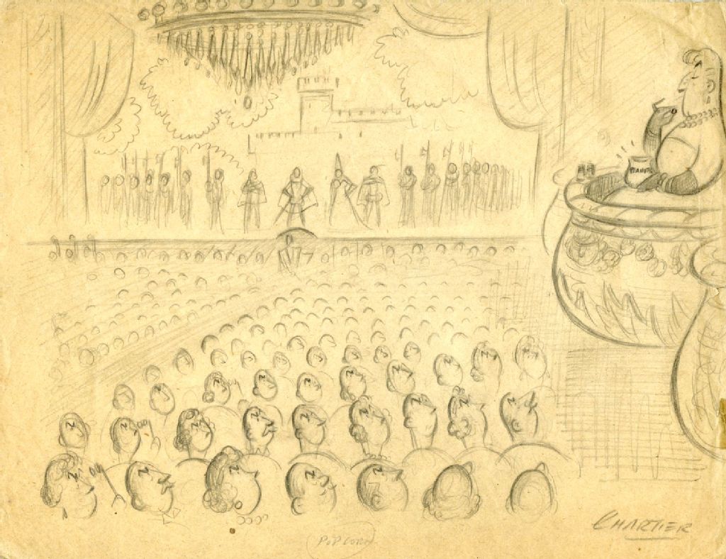 Le dessin montre les spectateurs dans la salle du théâtre tournant un visage furieux vers une femme au balcon grignotant des arachides pendant que se joue l'opéra