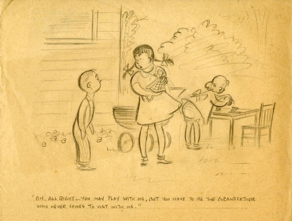 Le dessin présente deux fillettes jouant à la poupée. L'une des fillettes s'adresse à un petit garçon lui disant "Oh, all right. You may play with us, but you have to be the grandfather who never comes to visit with us."