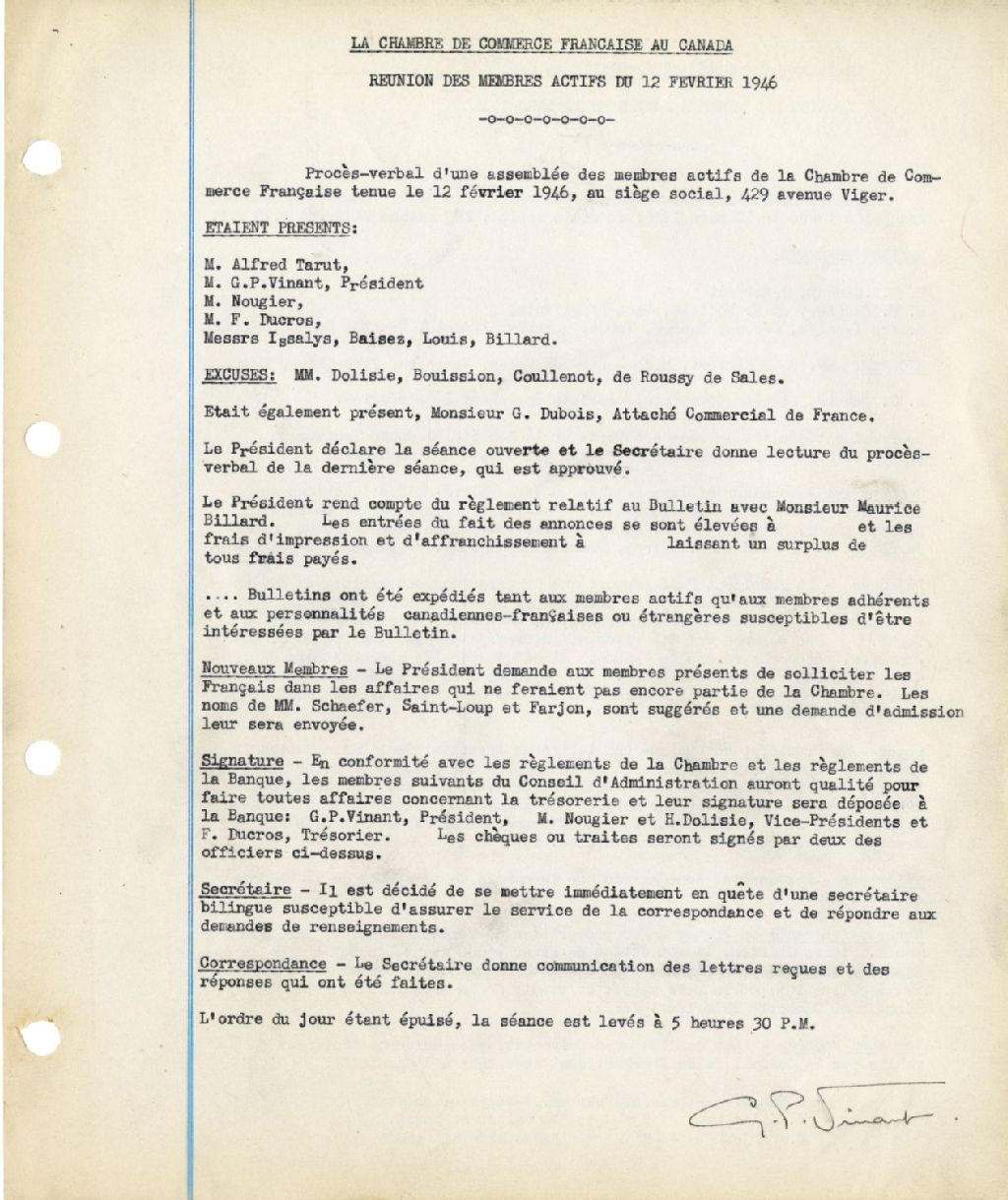 - Procès-verbaux de l'assemblée générale des membres actifs de la Chambre de commerce française au Canada, du 12 février 1946 au 16 février 1956