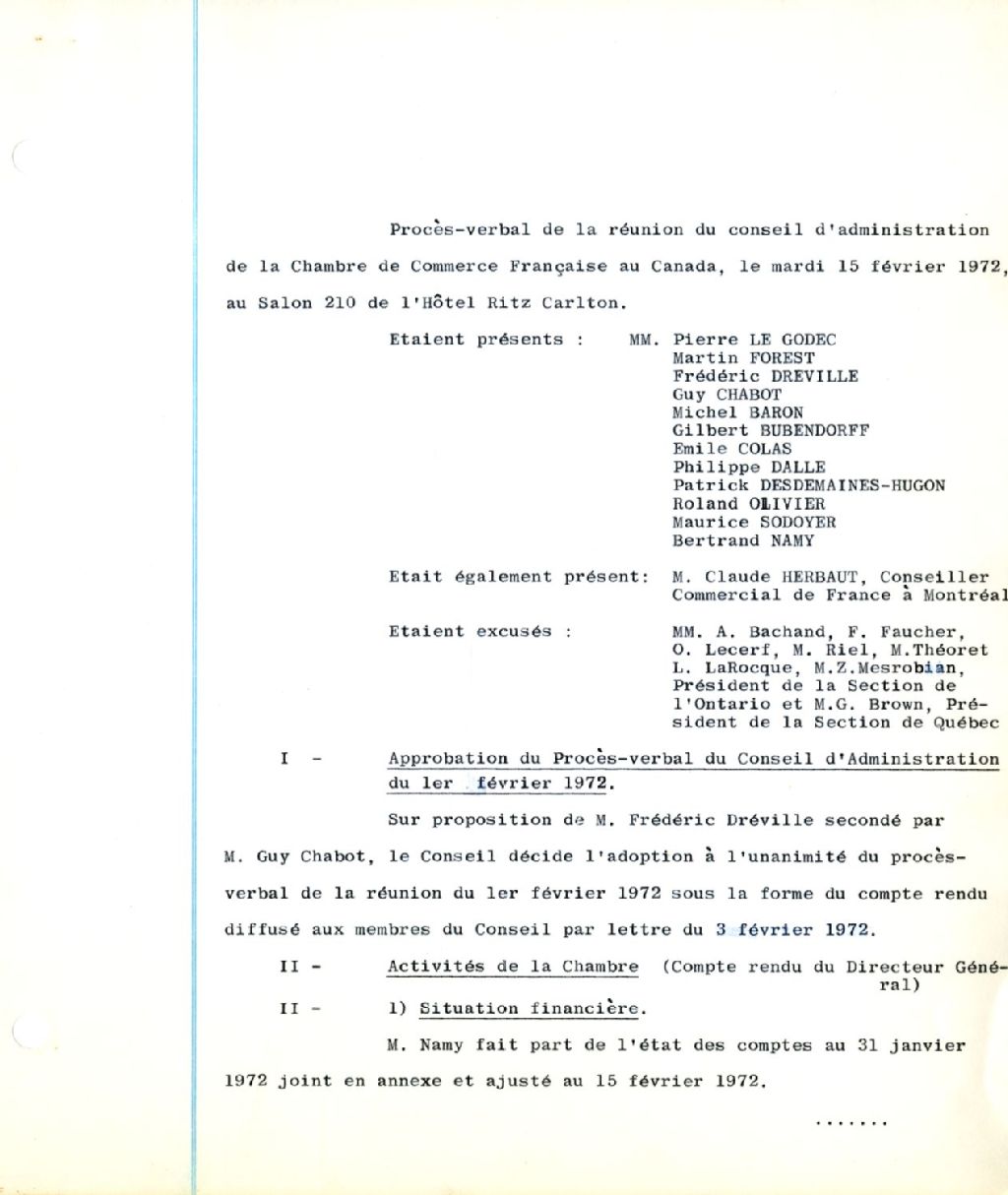 Procès-verbaux du conseil d'administration de la Chambre de commerce française au Canada, du 15 février au 9 novembre 1972