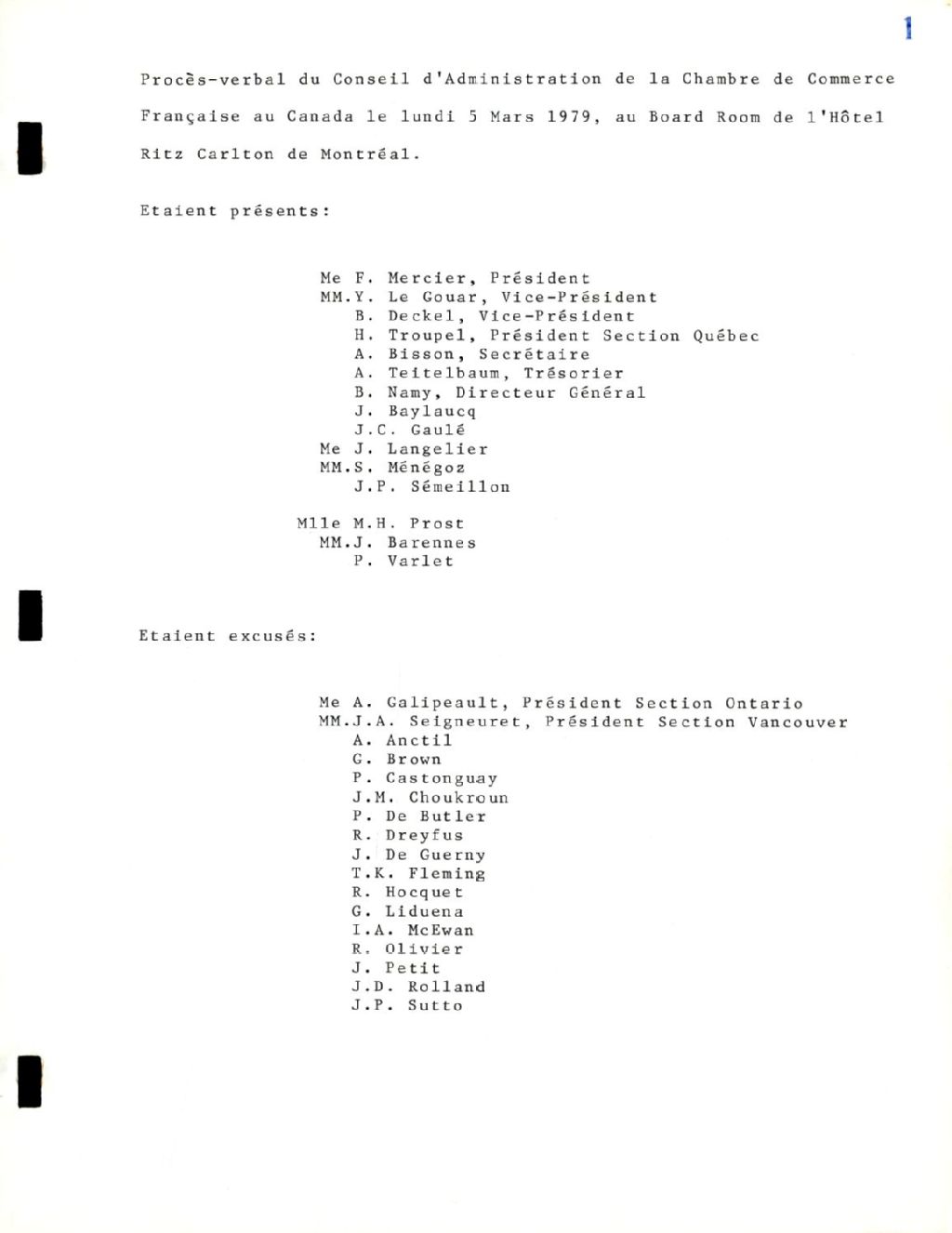 - Procès-verbaux du conseil d'administration de la Chambre de commerce française au Canada, du 5 mars au 6 décembre 1979