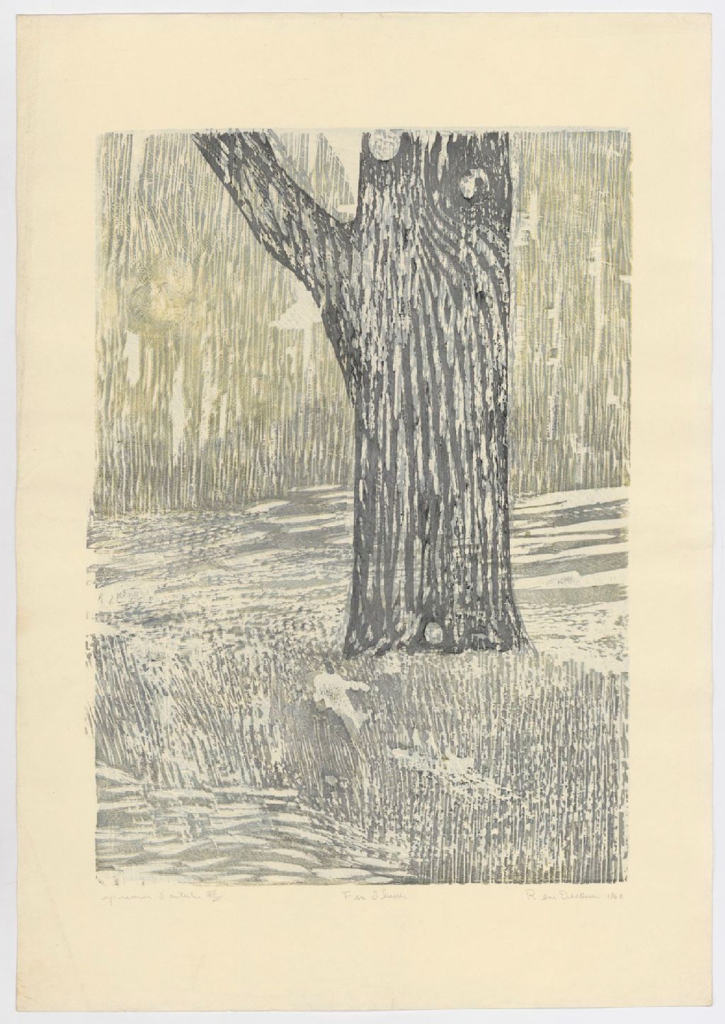 1 estampe : gravure sur bois en couleur, sur papier vélin crème ; image 61 x 43 cm