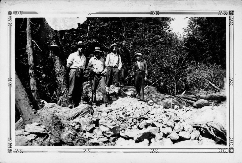 Belleterre - Canton Guillet (Mine Mud Lake Guillet). Cinq hommes debout sur l'emplacement de la découverte., 1936-06, Archives nationales à Rouyn-Noranda, Fonds Ministère des Richesses naturelles, (08Y,E20,S2,SS1,P416), Photographe non identifié.