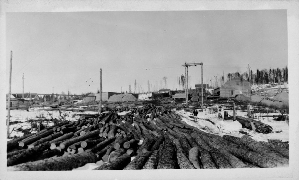 Normétal - (Abana?) Au premier plan, accumulation de bois en longueur et en arrière-plan, vue générale des bâtiments miniers.
