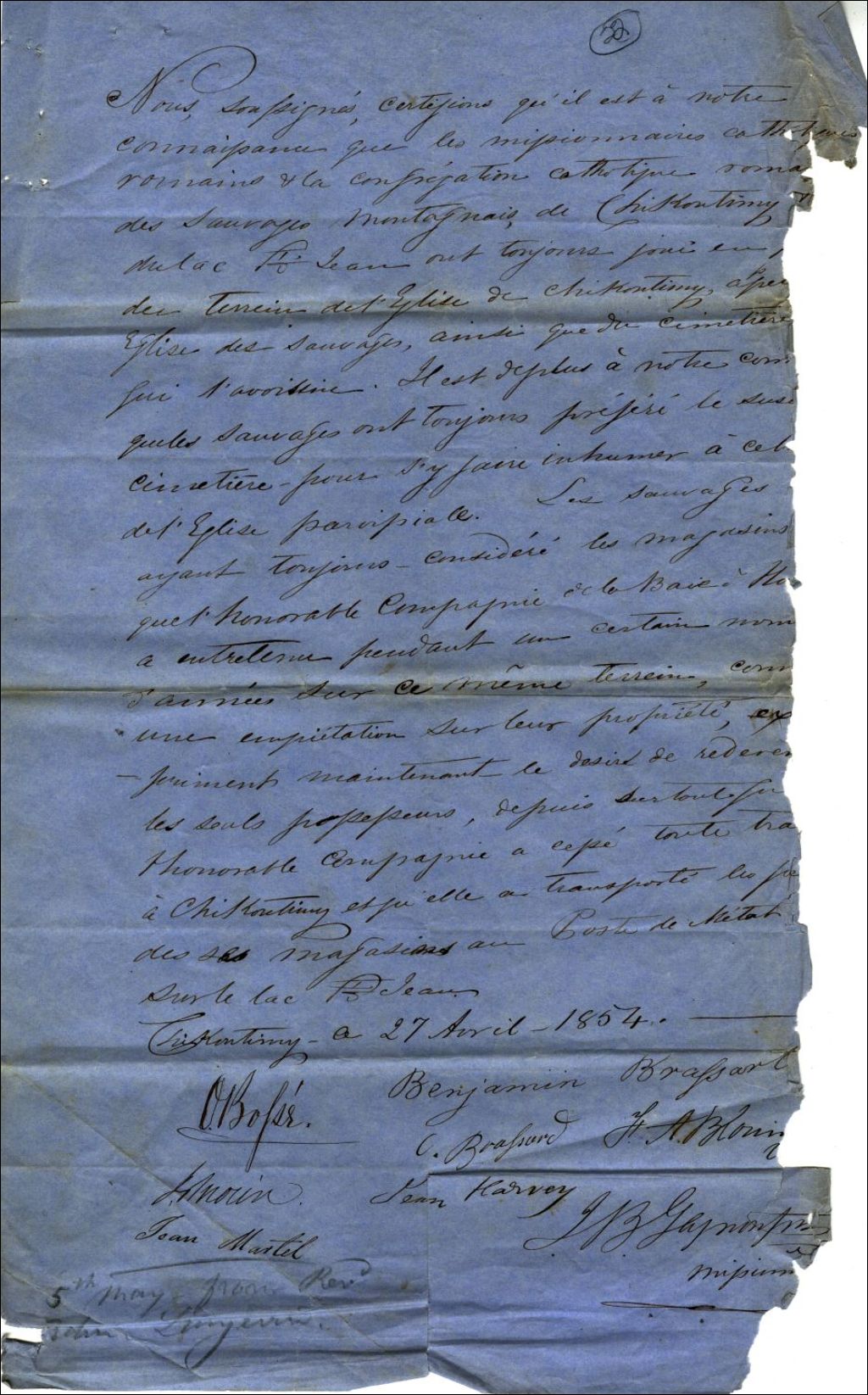 Les signataires affirment que les terrains appartiennent aux sauvages de la mission de Chicoutimy.Sont présentes les signatures de Ovide Bossé, E.Morin,Benjamin Brassart,O.Brassart,A.Blouin,Jean Harvey,J.-B. Gagnon, prêtre et missionnaire