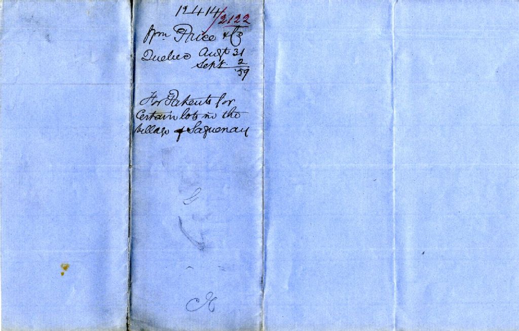 - William Price écrit à C.M. Vankoughnet à la Commission des terres de la couronne, car celui-ci désire avoir ses titres à Chicoutimi, à Grande-Baie et à l'Anse-Saint-Jean