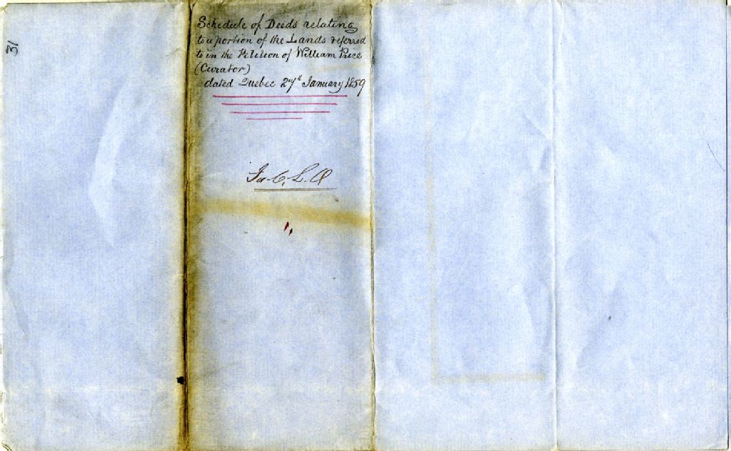 Schedule of deeds relating to...on the petition of W.Price, 1859, Archives nationales à Saguenay, Fonds Ministère de l'Énergie et des Ressources naturelles, (02C,E78,S1,P31).