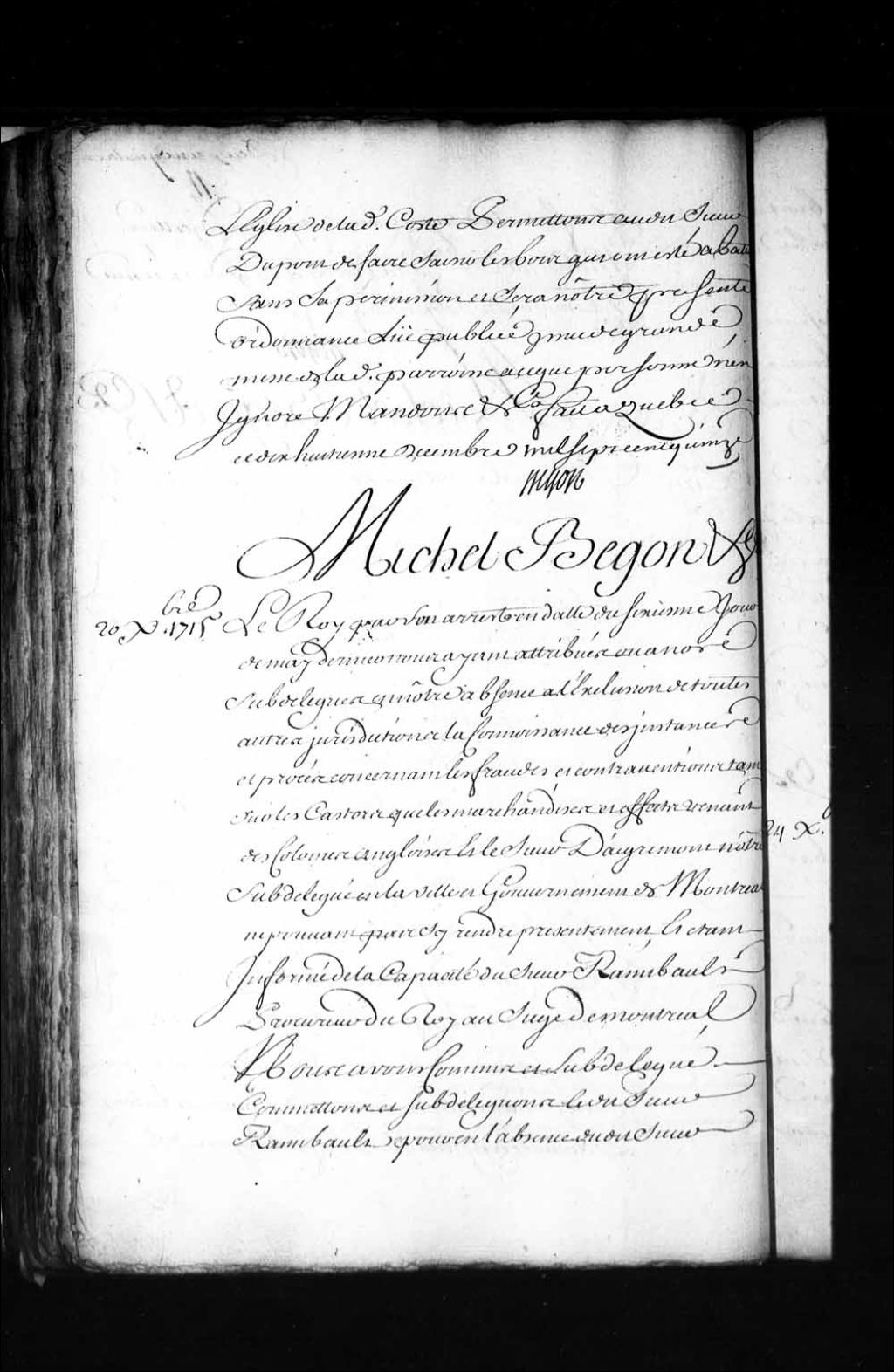Commission de subdélégué de l'intendant à Montréal, par l'intendant Bégon, pour le sieur Raimbault (Raimbaud), procureur du Roi, pour prendre connaissance des instances et procès au sujet des fraudes tant sur les castors que sur les marchandises anglaises, 20 décembre 1715, Archives nationales à Québec, Fonds Intendants, (03Q,E1,S1,D6,P1011).