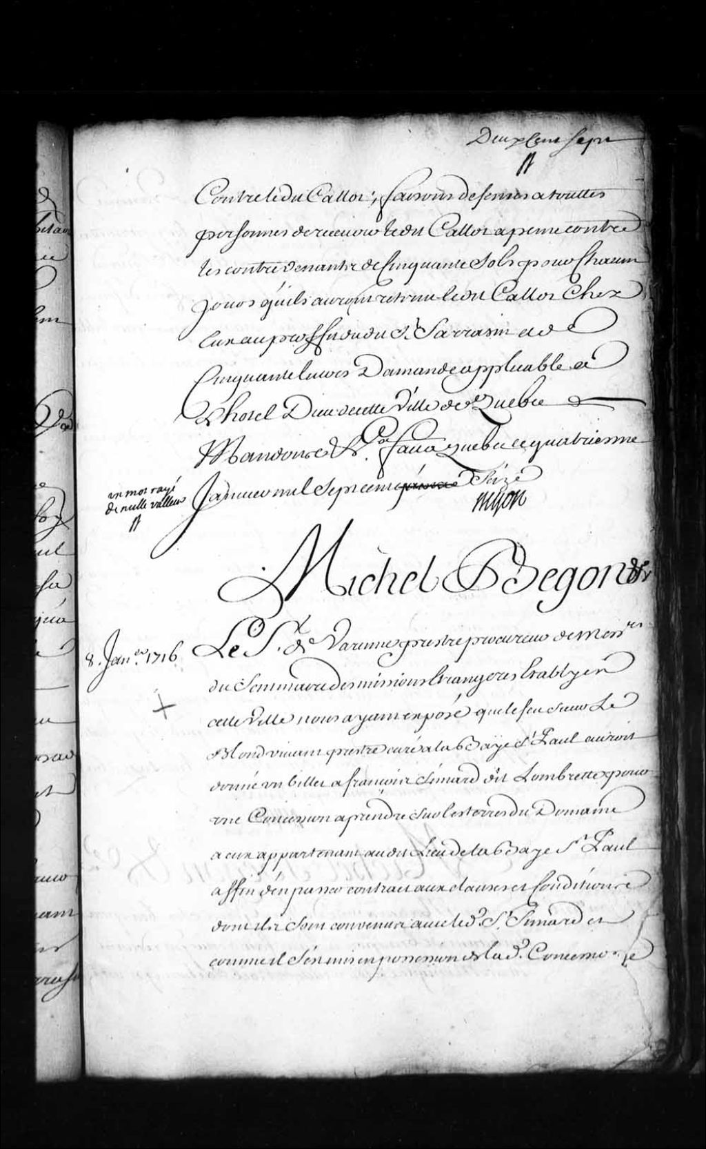 Ordonnance de l'intendant Bégon qui condamne François Simard dit Lombrette (Lombret), habitant de la Baie-Saint-Paul, à présenter le billet de concession d'une terre dans le domaine des Messieurs du Séminaire de Québec à la Baie-Saint-Paul que le feu sieur Leblond, vivant prêtre curé à la Baie-Saint-Paul, lui a donné, 8 janvier 1716, Archives nationales à Québec, Fonds Intendants, (03Q,E1,S1,D6,P1015).