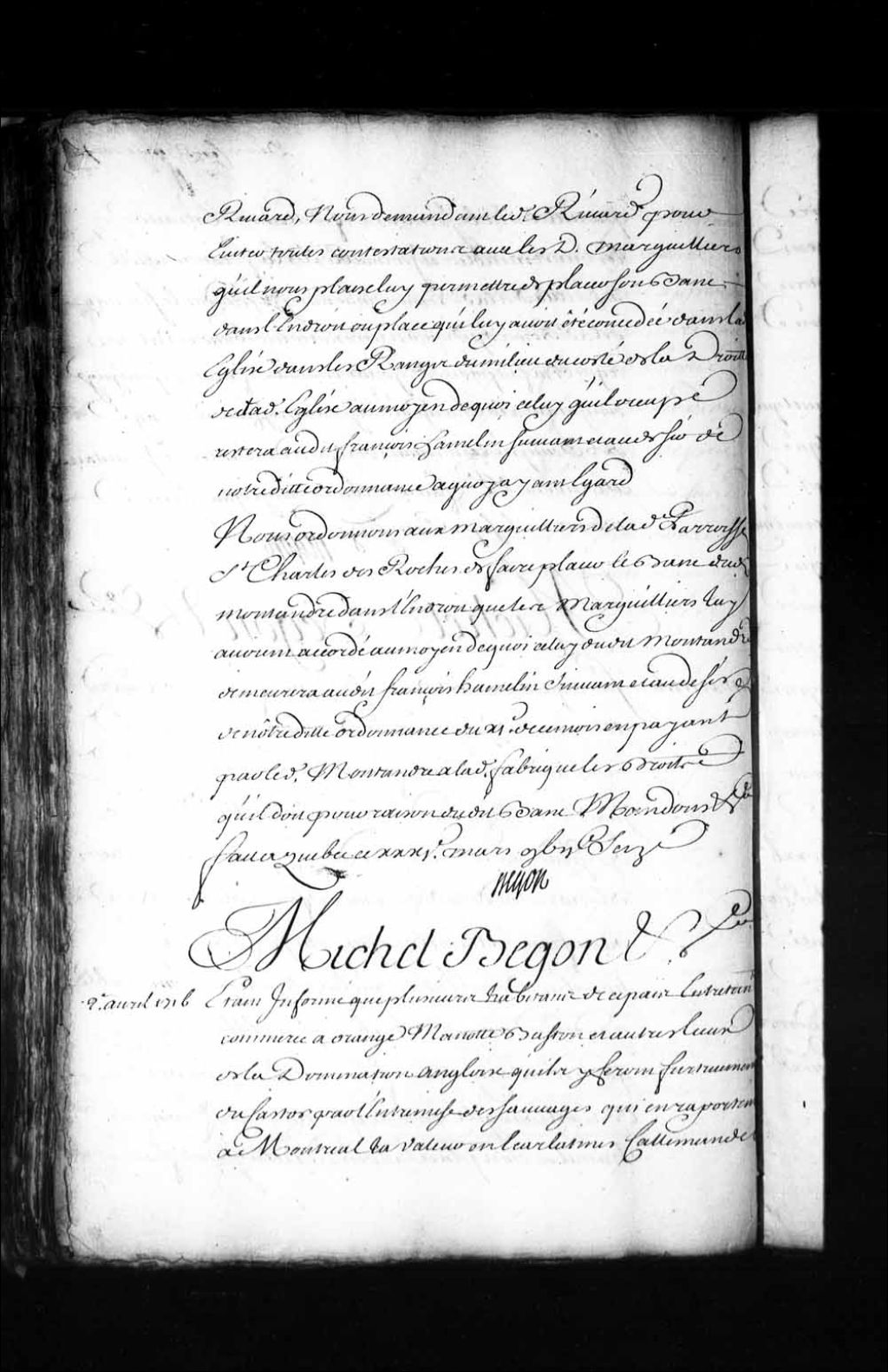 Ordonnance de l'intendant Bégon qui fait défense à toute personne, de quelque qualité et condition qu'elle soit, d'aller sous quelque prétexte que ce soit à Orange (Albany), Manatte (New York), Boston et autres lieux de la domination anglaise sans une permission du gouverneur général de ce pays, qu'il soit justifié ou non que lesdites personnes aient porté du castor dans lesdites colonies ou qu'elles en aient rapporté ou non des étoffes en ce pays, sous peine de deux mille livres d'amende pour la première fois et de punition corporelle en cas de récidive