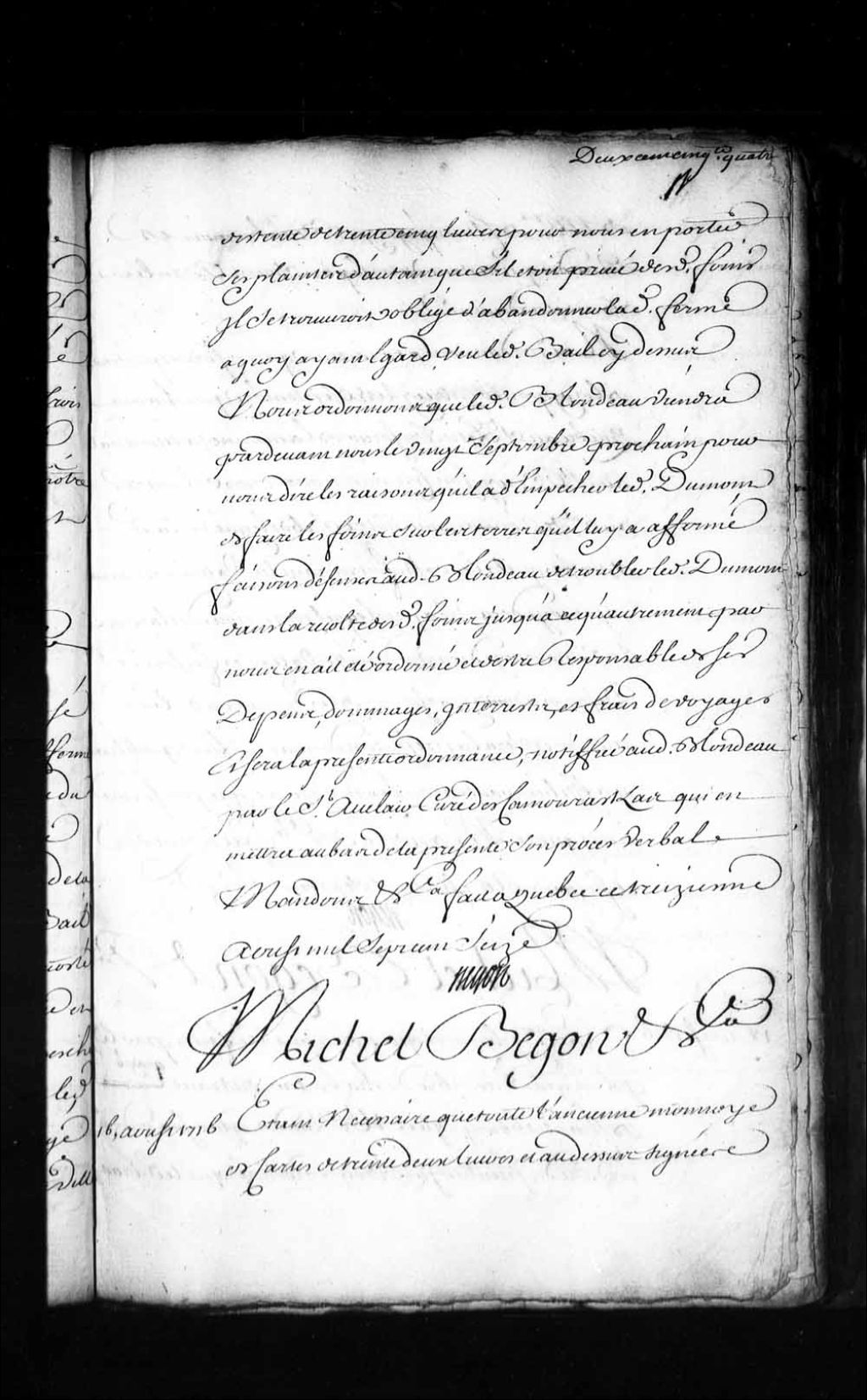 Ordonnance de l'intendant Bégon qui porte obligation pour tous d'apporter au sieur Petit à Québec, au sieur Berey à Montréal et au sieur de Tonnancour (Godefroy) aux Trois-Rivières, l'ancienne monnaie de carte de trente-deux livres signée par messieurs de Champigny, de Beauharnois et Raudot, 16 août 1716, Archives nationales à Québec, Fonds Intendants, (03Q,E1,S1,D6,P1065).
