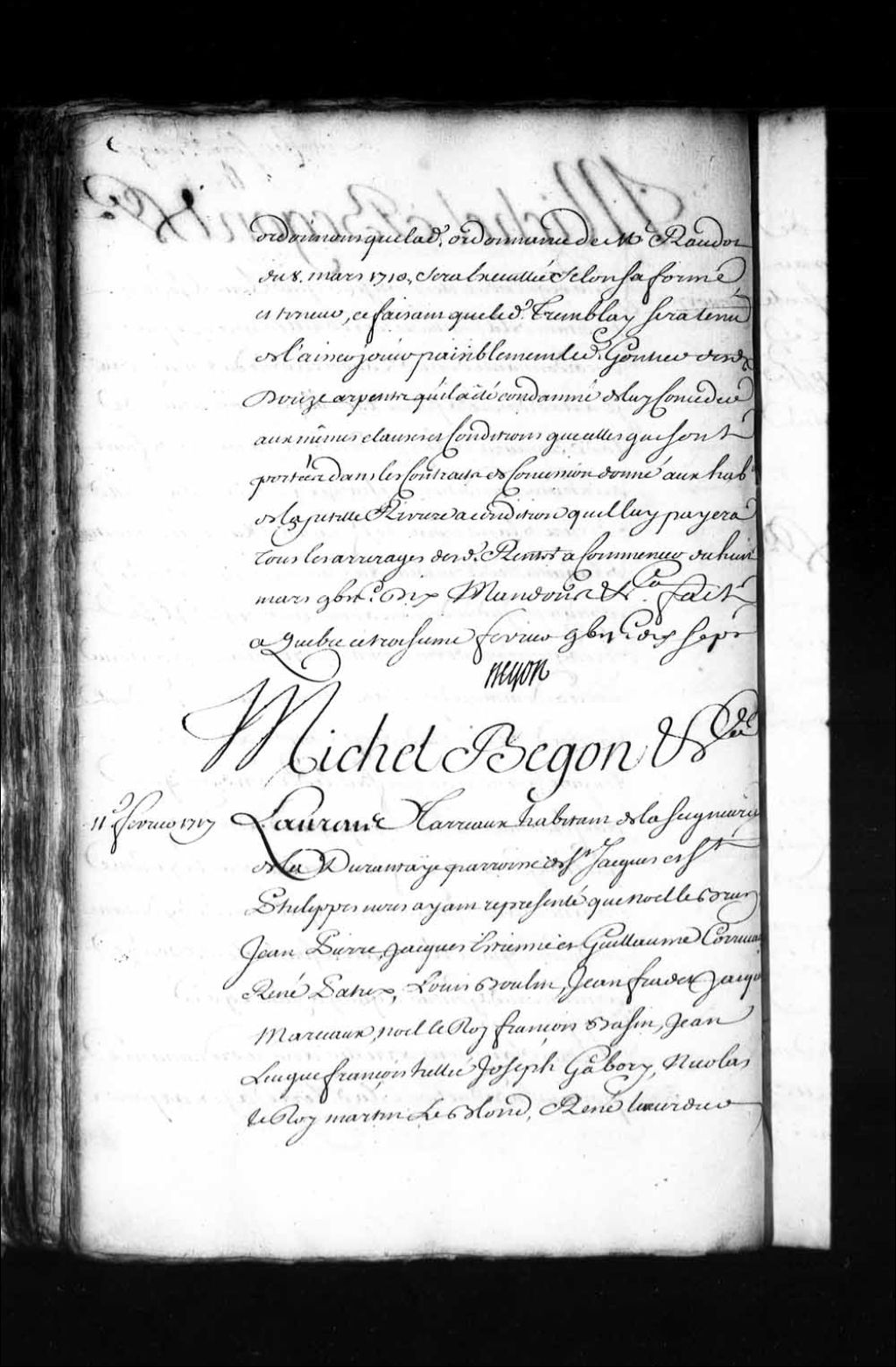 Ordonnance de l'intendant Bégon qui condamne Noël Brun, Jean-Pierre Corriveau, Jacques-Étienne Corriveau, Guillaume Corriveau, René Patry, Louis Boutin, Jean Fradet (Fredet), Jacques Marceau, Noël LeRoy (Roy), François Bazin, Jean Levêque (Lévesque), François Héllie (Élie), Joseph Gaboury, Nicolas LeRoy (Roy), Martin Leblond, René Laverdière, Étienne Roy, Pierre Feuilleteau (Filteau, Fecteau), habitants de Saint-Jacques et Saint-Philippe (Saint-Vallier), seigneurie de Bellechasse, à payer chacun un minot de blé et fournir une journée de travail à Laurent Terreau pour aider à bâtir sa grange, comme ils s'y sont engagés le 31 mai 1712 pour le dédommager du terrain qu'il a donné pour bâtir l'église de ladite paroisse