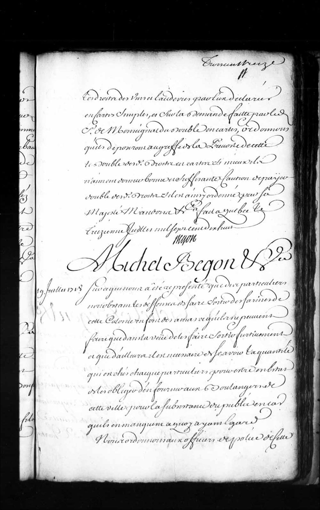 Ordonnance de l'intendant Bégon qui oblige les officiers de police de la ville de Québec à faire une visite exacte chez tous les particuliers pour savoir la quantité de blé et de farine qu'ils ont chez eux ou qu'ils ont achetée, 19 juillet 1718, Archives nationales à Québec, Fonds Intendants, (03Q,E1,S1,D6,P1122).