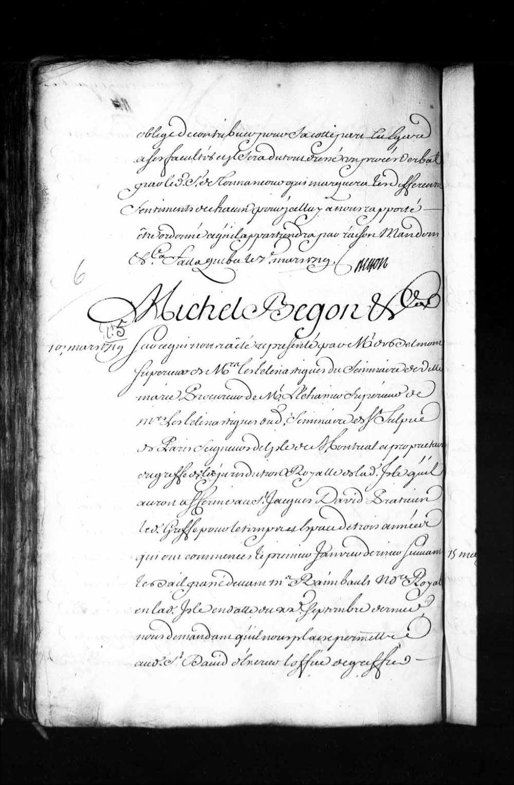 Commission à Jacques David, praticien, par l'intendant Bégon pour exercer l'office de greffier de la Juridiction royale de Montréal, conformément au bail d'affermage que lui ont consenti les messieurs de Saint-Sulpice pour trois années, 10 mars 1719, Archives nationales à Québec, Fonds Intendants, (03Q,E1,S1,D6,P1133).