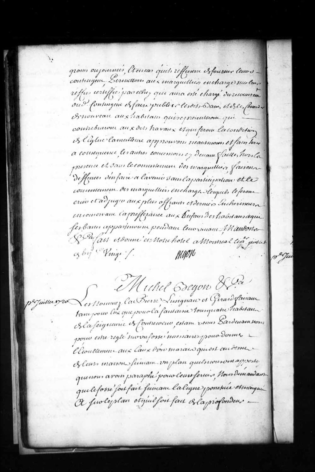Ordonnance de l'intendant Bégon entre les nommés Lapierre, Lusignan, Girard et Lafontaine, habitants de Contrecoeur, au sujet d'un fossé à pratiquer pour donner l'écoulement aux eaux d'un marais qui est au-dessus de leurs maisons, 1er juillet 1720, Archives nationales à Québec, Fonds Intendants, (03Q,E1,S1,D7,P1187).