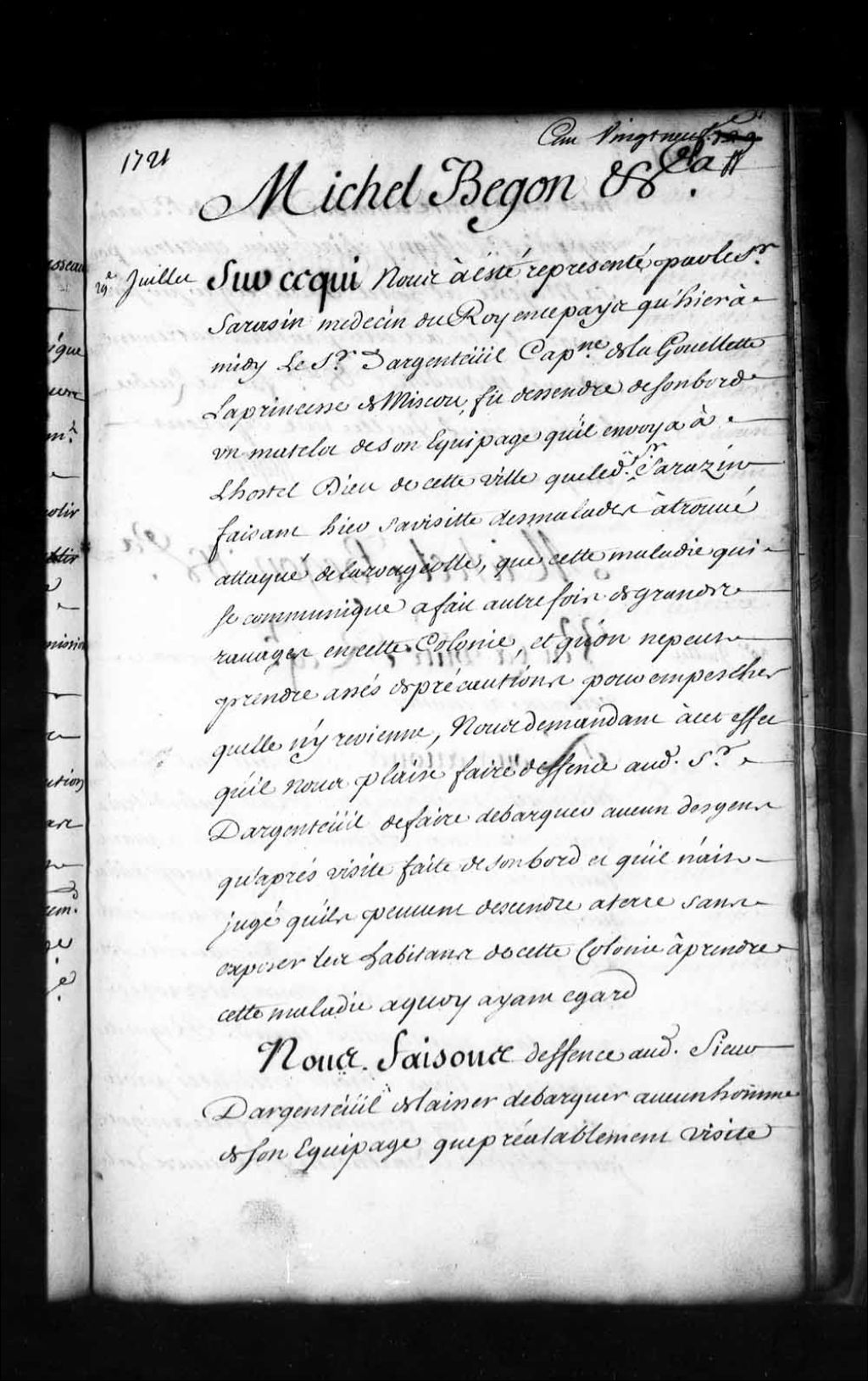 Ordonnance de l'intendant Bégon qui fait défense au sieur d'Argenteuil, capitaine de la goélette (bateau) "la Princesse de Miscou", de laisser débarquer aucun homme de son équipage, sans que préalablement visite n'ait été faite à son bord par le sieur Sarrazin, médecin du Roi en ce pays, ou par le sieur Coffigny, chirurgien entretenu par Sa Majesté à l'Hôtel-Dieu de Québec, 29 juillet 1721, Archives nationales à Québec, Fonds Intendants, (03Q,E1,S1,D7A,P1306).