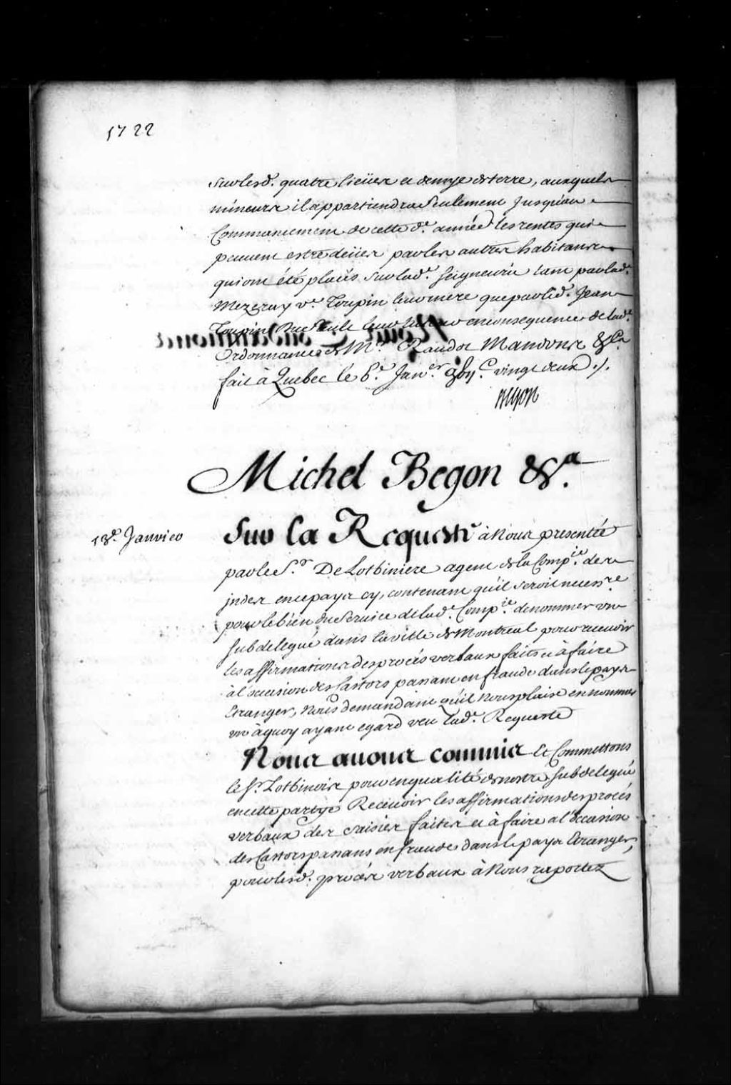 Commission par l'intendant Bégon au sieur de Lobinois pour, en qualité de subdélégué de l'intendant en la ville de Montréal, recevoir les affirmations des procès-verbaux des saisies faites et à faire à l'occasion des castors passants en fraude dans les pays étrangers, 13 janvier 1722, Archives nationales à Québec, Fonds Intendants, (03Q,E1,S1,D8,P1357).