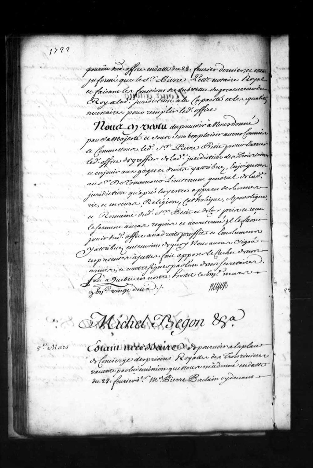 Commission de concierge des prisons royales des Trois-Rivières par l'intendant Bégon à Jacques Baby (Babie), en remplacement de Pierre Poulain (Poulin), 8 mars 1722, Archives nationales à Québec, Fonds Intendants, (03Q,E1,S1,D8,P1371).