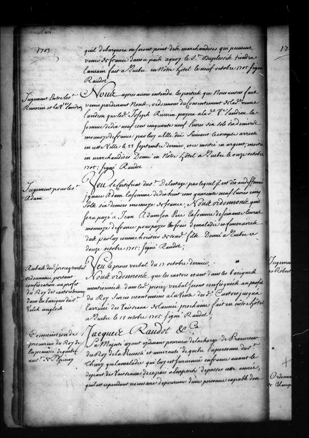 Ordonnance de l'intendant Jacques Raudot en faveur de Jean Adam au sujet d'un compte dû à son fils, feu Ignace Adam, au montant de 1 849 livres selon un certificat de sieur de Lestage, laquelle ordonnance enjoint le débiteur à donner la somme de 60 livres audit Jean Adam pour payer les frais de maladie et les frais funéraires de son fils
