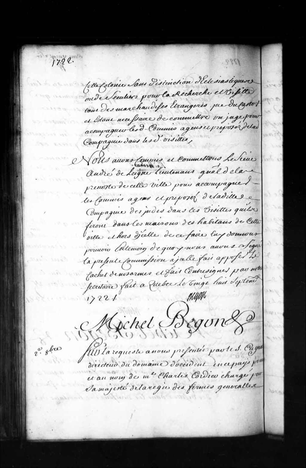 Ordonnance de l'intendant Bégon qui déclare bonne et valable la saisie de deux ancres d'eau-de-vie faite à bord d'un canot du "Comte de Toulouse" par François Lallemant et Pierre Langlois, gardes de la brigade du Domaine d'Occident, et François Auger, Joseph Labranche et Pierre Lecoq, gardes de la Compagnie des Indes, 2 octobre 1722, Archives nationales à Québec, Fonds Intendants, (03Q,E1,S1,D8,P1443).