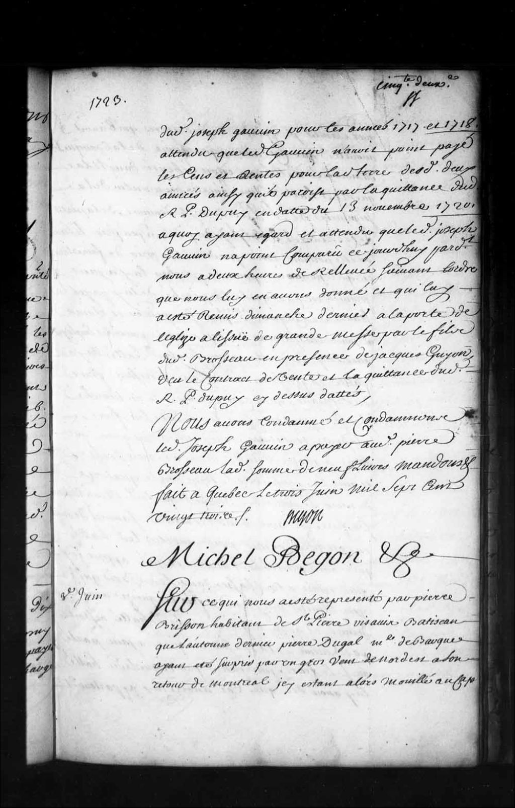 Ordonnance de l'intendant Bégon entre Pierre Brisson, habitant de Saint-Pierre vis-à-vis Batiscan, et le nommé Hallé, maître de barque, au sujet d'une ancre perdue que ledit Brisson a retirée du fond de l'eau, 3 juin 1723, Archives nationales à Québec, Fonds Intendants, (03Q,E1,S1,D9,P1508).