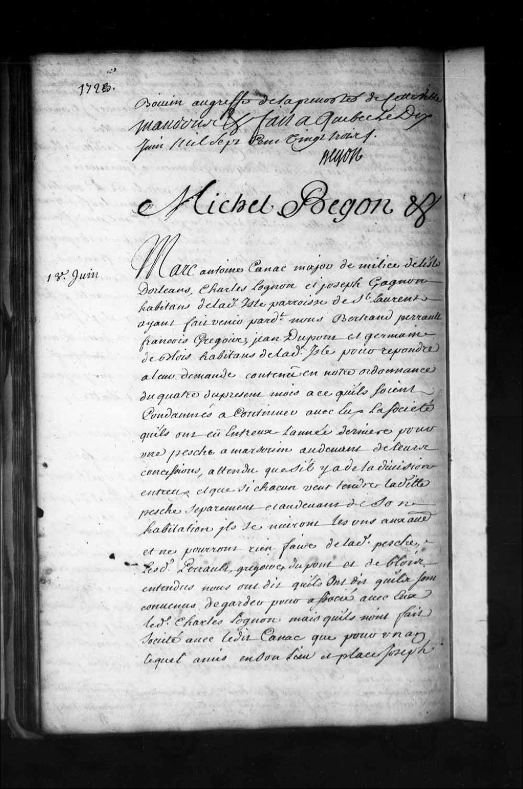 Ordonnance de l'intendant Bégon entre Marc-Antoine Canac (dit Marquis), major de milice de l'île d'Orléans, Charles Lognon (Loignon) et Joseph Gagnon, de Saint-Laurent de l'île d'Orléans, et Bertrand Perrault, François Grégoire, Jean Dupont et Germain Deblois, habitants de ladite île, au sujet d'une société formée entre eux pour exploiter une pêche aux marsouins, 13 juin 1723, Archives nationales à Québec, Fonds Intendants, (03Q,E1,S1,D9,P1519).