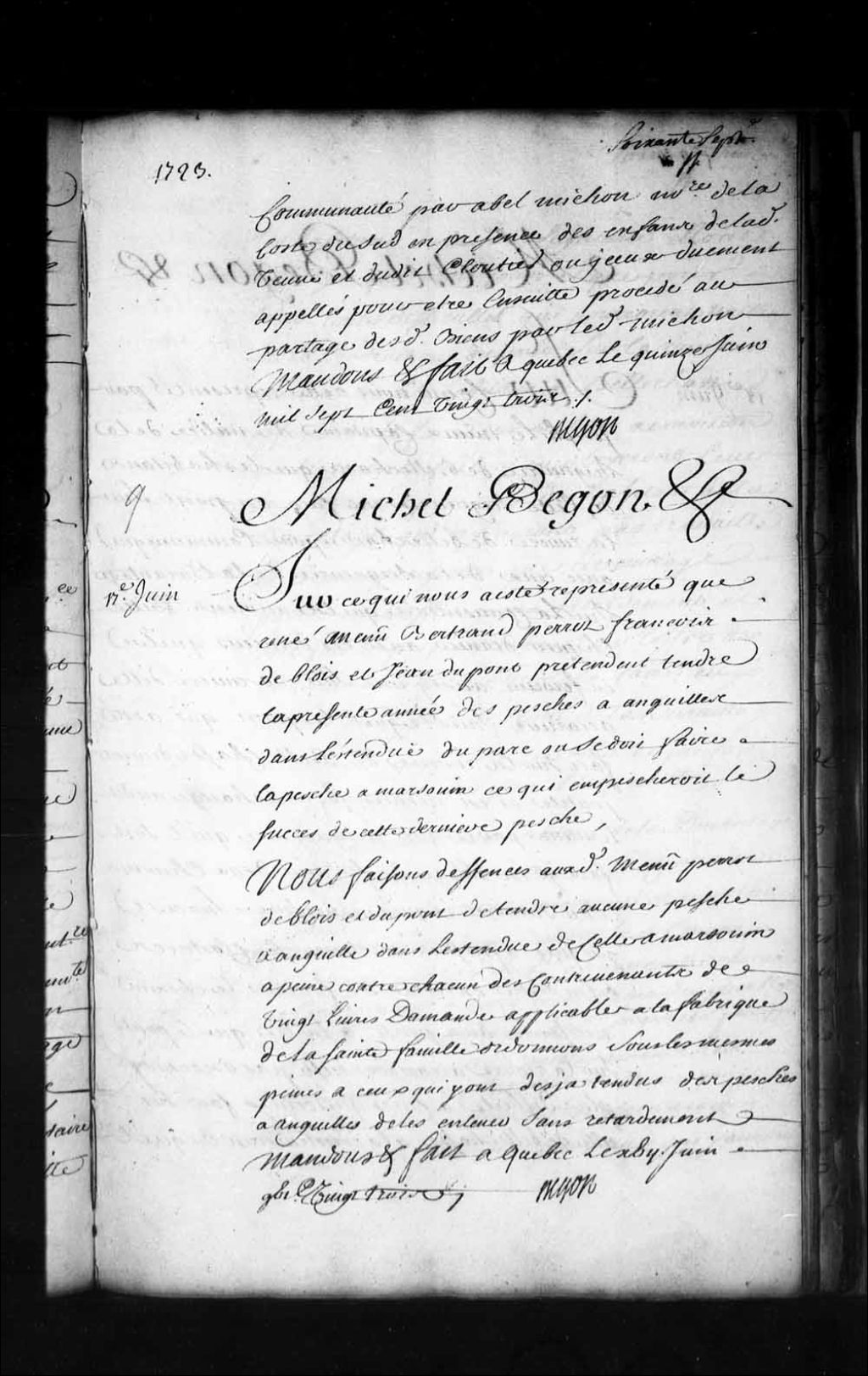 Ordonnance de l'intendant Bégon qui fait défense à René Menu (Meneux), Bertrand Perrot (Perrault, Perreault), François Deblois et Jean Dupont de tendre aucune pêche à l'anguille dans l'étendue du parc de pêche au marsouin de l'île d'Orléans à peine contre chacun des contrevenants de vingt livres d'amende applicable à la fabrique de la Sainte-Famille