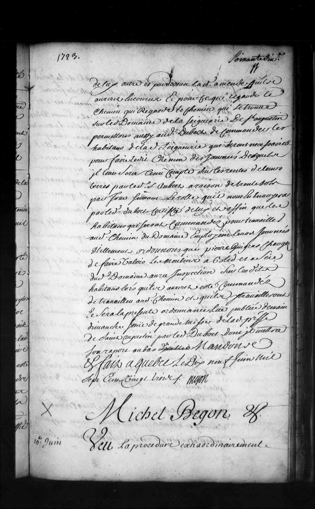 Ordonnance de l'intendant Bégon qui condamne Pierre Ozanne et Simon Valois, habitants de Lachine, solidairement et par corps en cent livres d'amende chacun applicable à l'Hôtel-Dieu de Montréal pour avoir traité de l'eau-de-vie avec les Sauvages (Amérindiens) au lac Saint-François, 19 juin 1723, Archives nationales à Québec, Fonds Intendants, (03Q,E1,S1,D9,P1527).