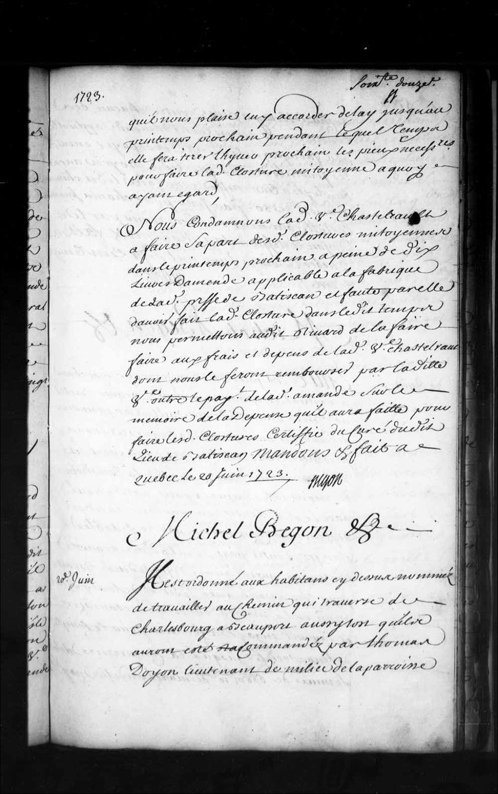 Ordonnance de l'intendant Bégon qui porte que les habitants desdits lieux travailleront au chemin qui traverse de Charlesbourg à Beauport à peine de trois livres d'amende, 20 juin 1723, Archives nationales à Québec, Fonds Intendants, (03Q,E1,S1,D9,P1529).