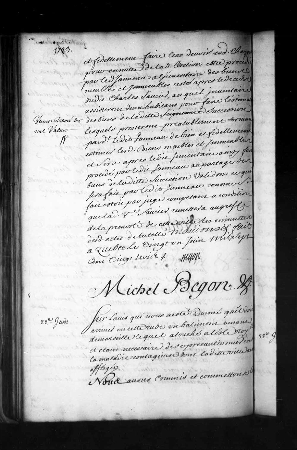 Ordonnance de l'intendant Bégon qui commet les officiers de l'Amirauté de Québec pour se transporter avec le sieur Bertier (Berthier), chirurgien, à bord d'un bâtiment venant de Marseille, dès son arrivée en la rade de Québec, se faire représenter les certificats de santé, faire visiter les malades par le sieur Bertier, obtenir tous les éclaircissements possibles du capitaine, etc. ; défense à l'équipage dudit bâtiment de descendre à terre à l'exception du capitaine, qui pourra y descendre avec lesdits officiers de l'Amirauté dans leur chaloupe ou canot, 22 juin 1723, Archives nationales à Québec, Fonds Intendants, (03Q,E1,S1,D9,P1536).