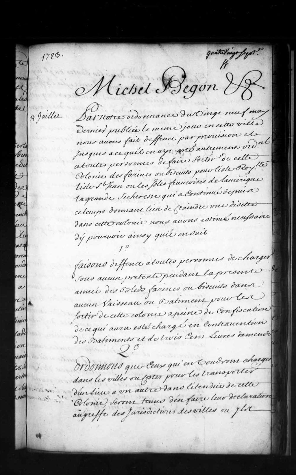 Ordonnance de l'intendant Bégon qui réglemente la sortie de la colonie des blés, farines et biscuits de la prochaine récolte, afin de contrer la sécheresse qui y sévit, 14 juillet 1723, Archives nationales à Québec, Fonds Intendants, (03Q,E1,S1,D9,P1540).