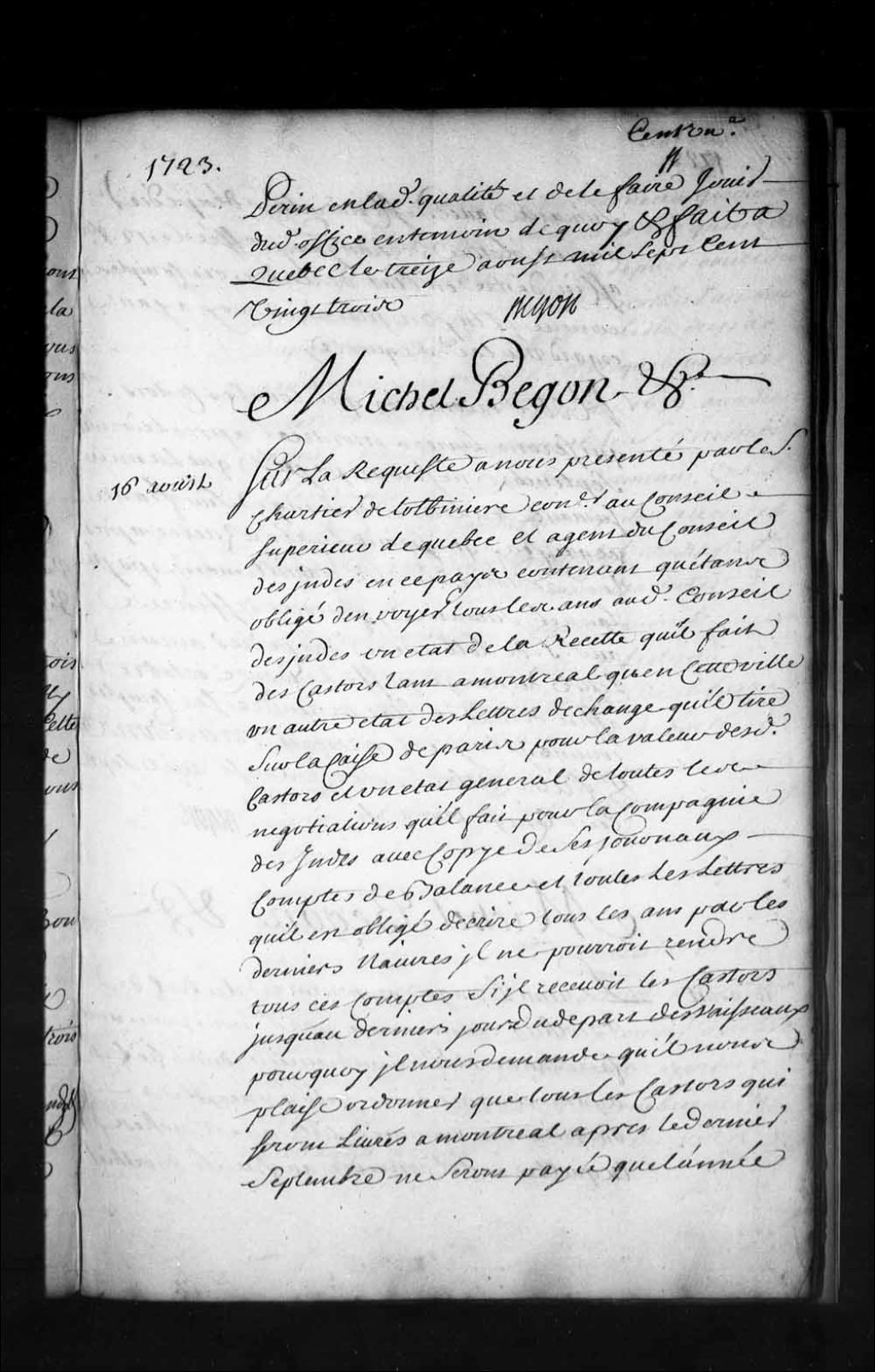 Ordonnance de l'intendant Bégon qui règle que tous les castors qui seront livrés à Montréal après le dernier jour de septembre ne seront payés que l'année suivante, en lettres de change de France, et que ceux qui seront livrés à Québec après le 10 octobre seront pareillement payés l'année suivante; défense au sieur de Lotbinière, agent de la Compagnie des Indes, d'expédier aucune lettre de change passé le 12 octobre, afin d'être en état de rendre ses comptes comme il lui est prescrit, 16 août 1723, Archives nationales à Québec, Fonds Intendants, (03Q,E1,S1,D9,P1552).