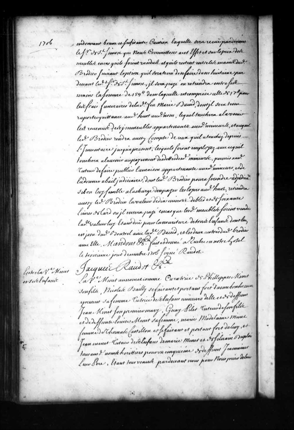 Ordonnance de l'intendant Jacques Raudot entre la veuve Minet et ses enfants au sujet du partage de la succession de feu Jean Minet, 03 décembre 1706, Archives nationales à Québec, Fonds Intendants, (03Q,E1,S1,D1,P164).