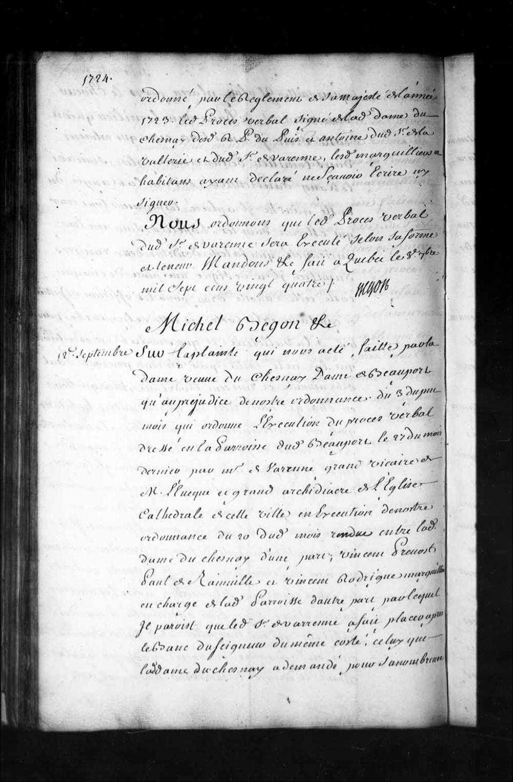 Ordonnance de l'intendant Bégon qui condamne les marguilliers de Beauport à remettre à l'endroit de l'église fixé par le sieur de Varennes, c'est-à-dire immédiatement en arrière du banc du seigneur, le banc de six pieds accordé par ledit sieur de Varennes à la dame Duchesnay à cause de sa nombreuse famille, et qui fait défense à tous de déplacer ledit banc à l'avenir à peine de cinquante livres d'amende, 12 septembre 1724, Archives nationales à Québec, Fonds Intendants, (03Q,E1,S1,D10,P1646).