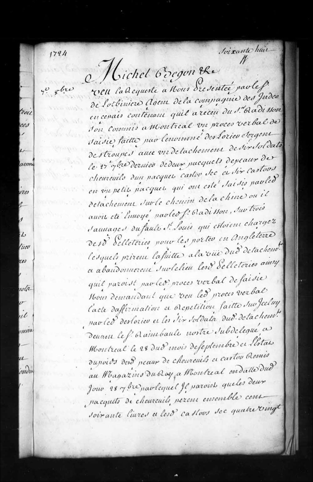 Ordonnance de l'intendant Bégon qui déclare bonne et valable la saisie faite sur trois Sauvages (Amérindiens) du Sault-Saint-Louis, par le sergent Deslauriers et un détachement de six soldats, de deux paquets de peaux de chevreuil, deux paquets de castor sec et six castors en un petit paquet et qui décide que les pelleteries saisies seront et demeureront confisquées au profit de la Compagnie des Indes, 7 octobre 1724, Archives nationales à Québec, Fonds Intendants, (03Q,E1,S1,D10,P1649).