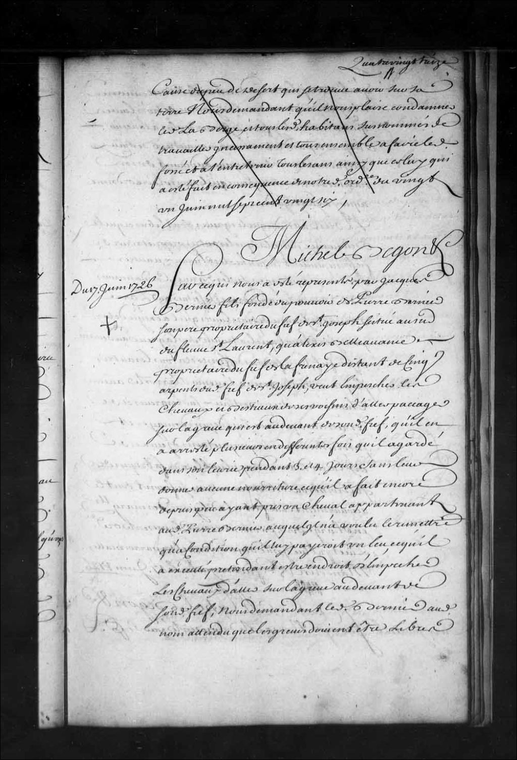 Ordonnance de l'intendant Bégon qui condamne Alexis Bellavance, propriétaire du fief de Lafrenaye (Lafresnaye), à rendre à Pierre Bernier, propriétaire du fief Saint-Joseph, la somme de trois livres qu'il a exigée de lui pour son cheval trouvé sur la grève au-devant de son fief, 17 juin 1726, Archives nationales à Québec, Fonds Intendants, (03Q,E1,S1,D11,P1743).