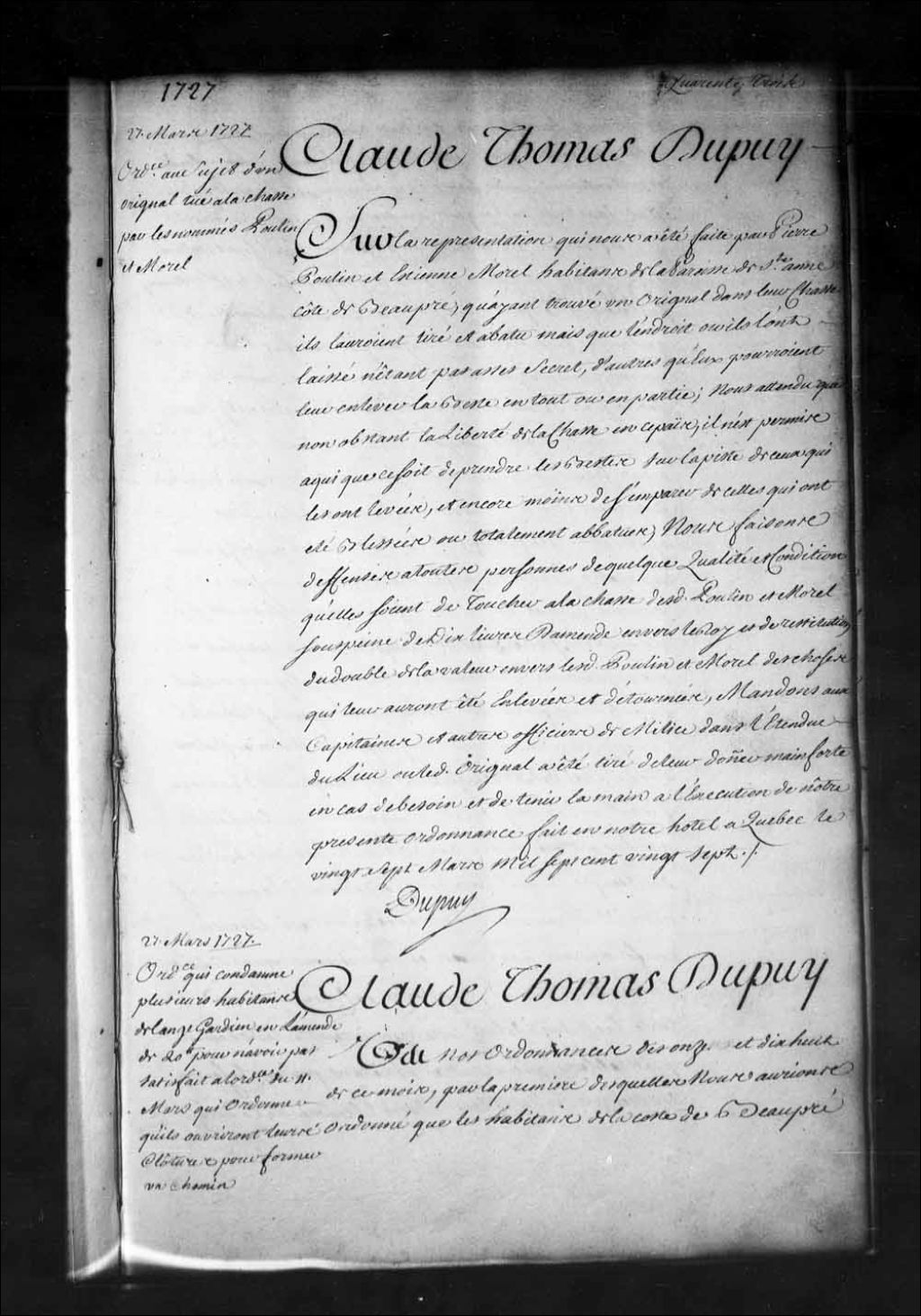 Ordonnance de l'intendant Dupuy qui défend à toutes personnes de toucher à la chasse de Pierre Poulin et Étienne Morel, habitants de Sainte-Anne-de-Beaupré, sous peine de dix livres d'amende envers le Roi et de restitution du double de la valeur envers lesdits Poulin et Morel des choses qui leur auront été enlevées et détournées, 27 mars 1727, Archives nationales à Québec, Fonds Intendants, (03Q,E1,S1,D12A,P1817).