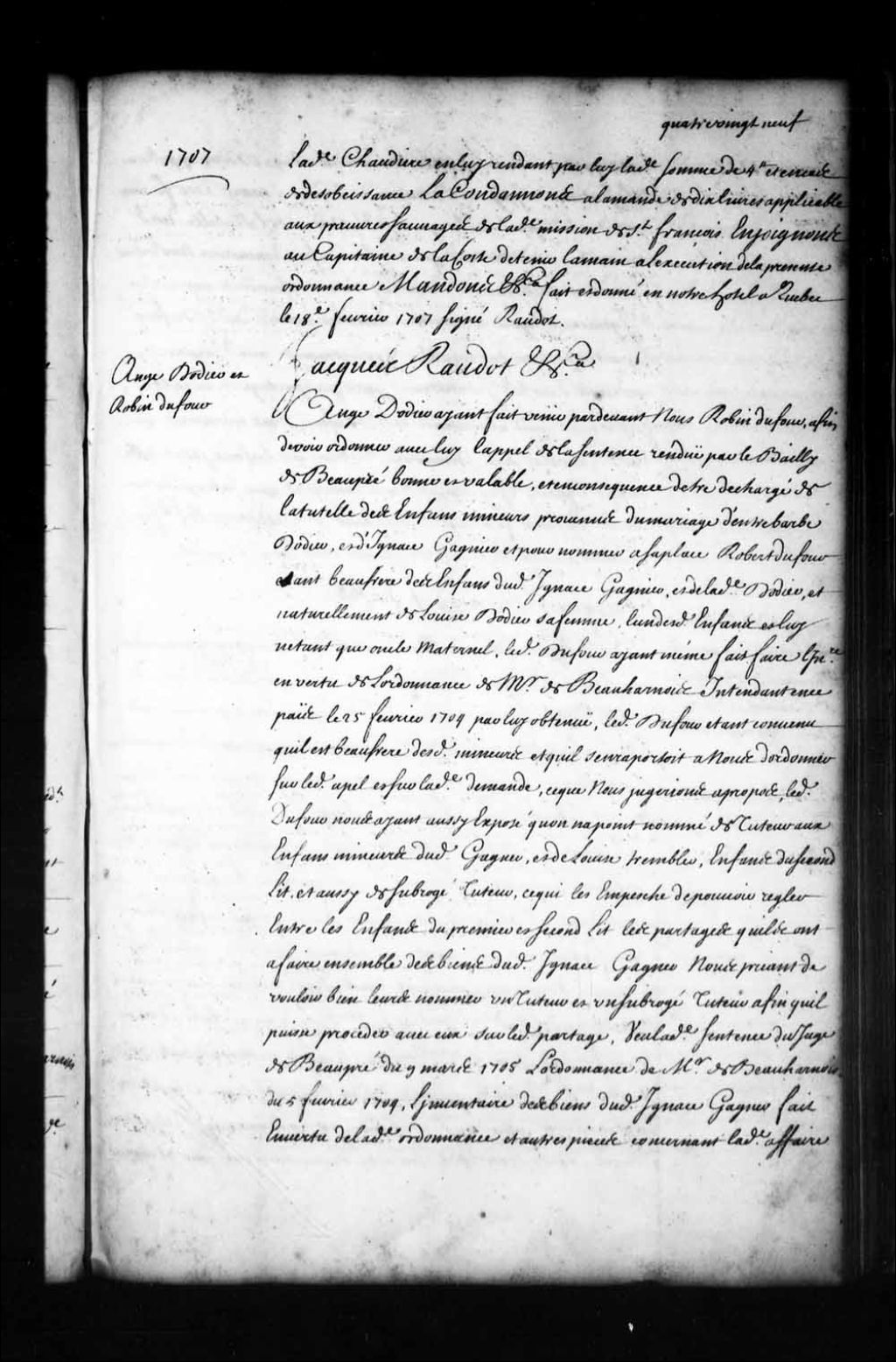 Ordonnance de l'intendant Jacques Raudot qui décide de la tutelle des enfants mineurs issus des deux mariages d'Ignace Gagné et du partage des meubles appartenant auxdits enfants mineurs entre Louise Tremblay, veuve en secondes noces d'Ignace Gagné, et Robin (Robert) Dufour, 25 février 1707, Archives nationales à Québec, Fonds Intendants, (03Q,E1,S1,D1,P189).