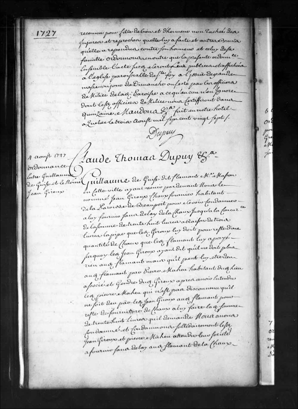 Ordonnance de l'intendant Dupuy qui condamne solidairement Jean Giroux et Pierre Maheu, chaufourniers de Beauport, à fournir sans délai à Guillaume Deguise dit Flamant, maître maçon, de Québec, de la chaux jusqu'à la concurrence de la somme de trente-huit livres à raison de trois livres la pipe, 4 août 1727, Archives nationales à Québec, Fonds Intendants, (03Q,E1,S1,D12A,P1902).