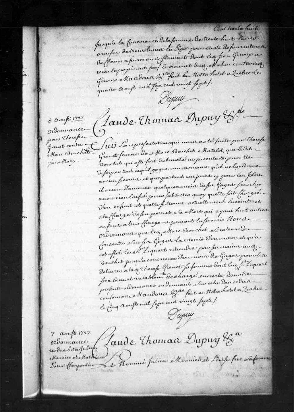 Ordonnance de l'intendant Dupuy qui porte que Marc Bouchet, matelot, débauché qui dissipe tout ce qu'il gagne, sera tenu de consentir sur ses gages la retenue d'un mois pour les remettre à Thérèse Grenet, sa femme