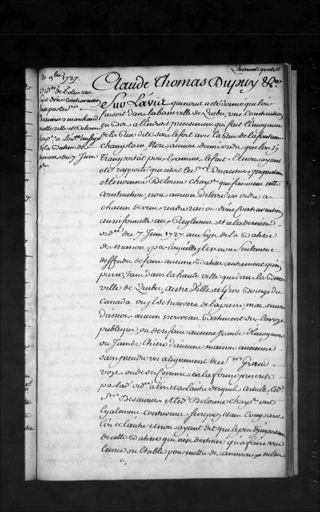 Ordonnance de l'intendant Dupuy qui condamne les sieurs Desauniers (Desaulniers) et Delorme à une amende de cent livres applicable moitié au couvent des Pères Récollets et l'autre moitié à la communauté des Soeurs de la Congrégation pour avoir, au mépris des ordonnances, commencé la construction d'une écurie en bois à l'endroit qui fait l'encoignure de la rue Sous-le-Fort avec la rue de la fontaine Champlain, à Québec, et avoir négligé de prendre alignement du grand voyer ou de ses commis, 20 novembre 1727, Archives nationales à Québec, Fonds Intendants, (03Q,E1,S1,D13,P1960).