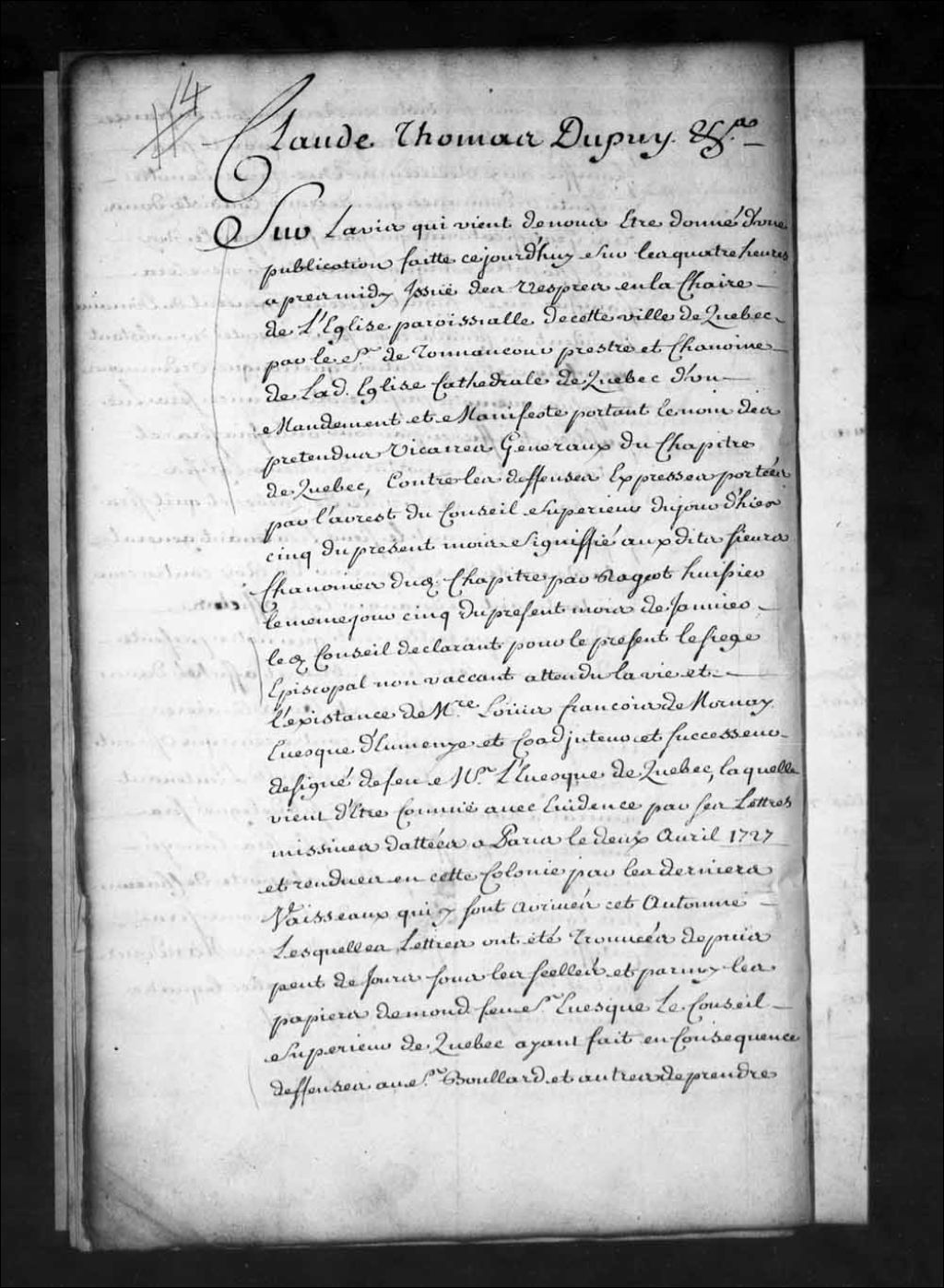- Ordonnance de l'intendant Dupuy qui défend aux prétendus vicaires-généraux du chapitre de Québec et à tous curés de publier aucun mandement et manifeste qui émane desdits prétendus vicaires-généraux sous peine de saisie de leur temporel
