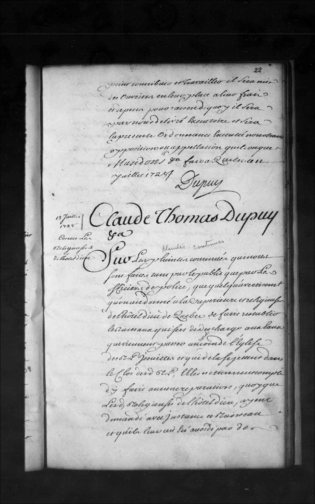Ordonnance de l'intendant Dupuy qui porte que, faute par les Religieuses de l'Hôtel-Dieu de Québec de mettre dès lundi prochain des ouvriers à l'oeuvre pour rétablir le ruisseau qui sert de décharge aux eaux qui viennent passer au coin de l'église des Pères Jésuites à Québec, il sera mis un nombre suffisant d'ouvriers pour faire ladite réparation aux dépens desdites religieuses, 13 juillet 1728, Archives nationales à Québec, Fonds Intendants, (03Q,E1,S1,D15,P1983).