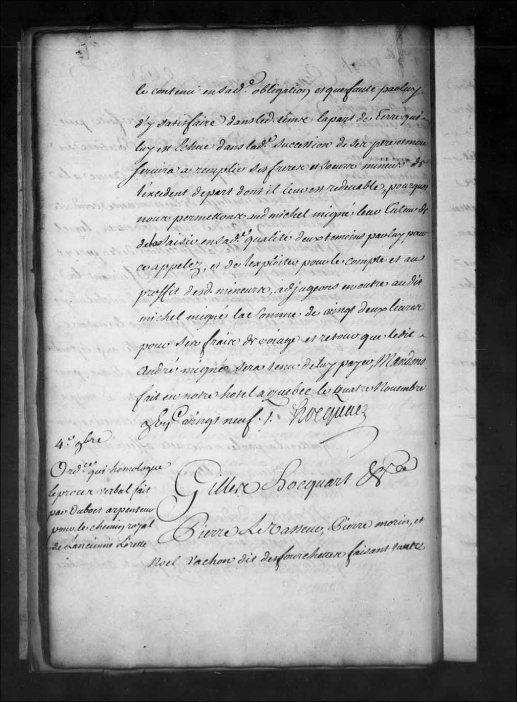 Ordonnance de Gilles Hocquart, faisant les fonctions d'intendant, qui homologue le procès-verbal dressé par Jean Duboct (Duboc), arpenteur et commissaire du grand voyer, le 24 juillet 1729, et décide qu'un chemin qui montera droit du quatrième rang de la seigneurie de Maure au chemin royal de la côte Saint-Ange, allant ledit chemin royal à L'Ancienne-Lorette, sera fait incessamment en commun par tous les habitants de la seigneurie de Maure qui en doivent tirer utilité avec un pont solide de douze pieds de largeur sur la rivière du Cap-Rouge, 4 novembre 1729, Archives nationales à Québec, Fonds Intendants, (03Q,E1,S1,D17,P2021).