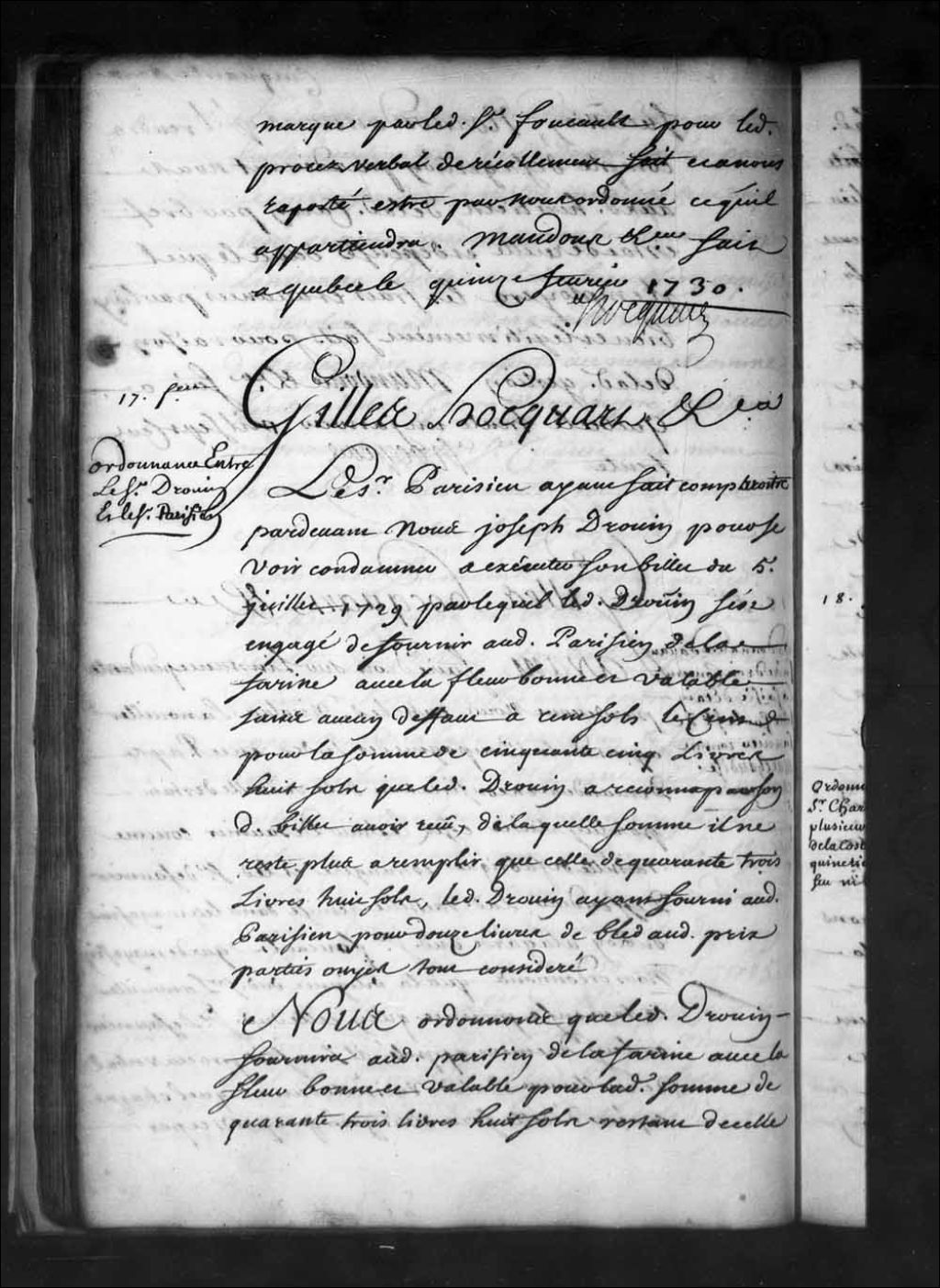 Ordonnance de Gilles Hocquart, faisant les fonctions d'intendant, qui condamne Joseph Drouin à fournir au nommé Parisien de la farine avec la fleur bonne et valable pour la somme de cinquante-cinq livres conformément à son marché du 5 juillet 1729, 17 février 1730, Archives nationales à Québec, Fonds Intendants, (03Q,E1,S1,D17,P2066).