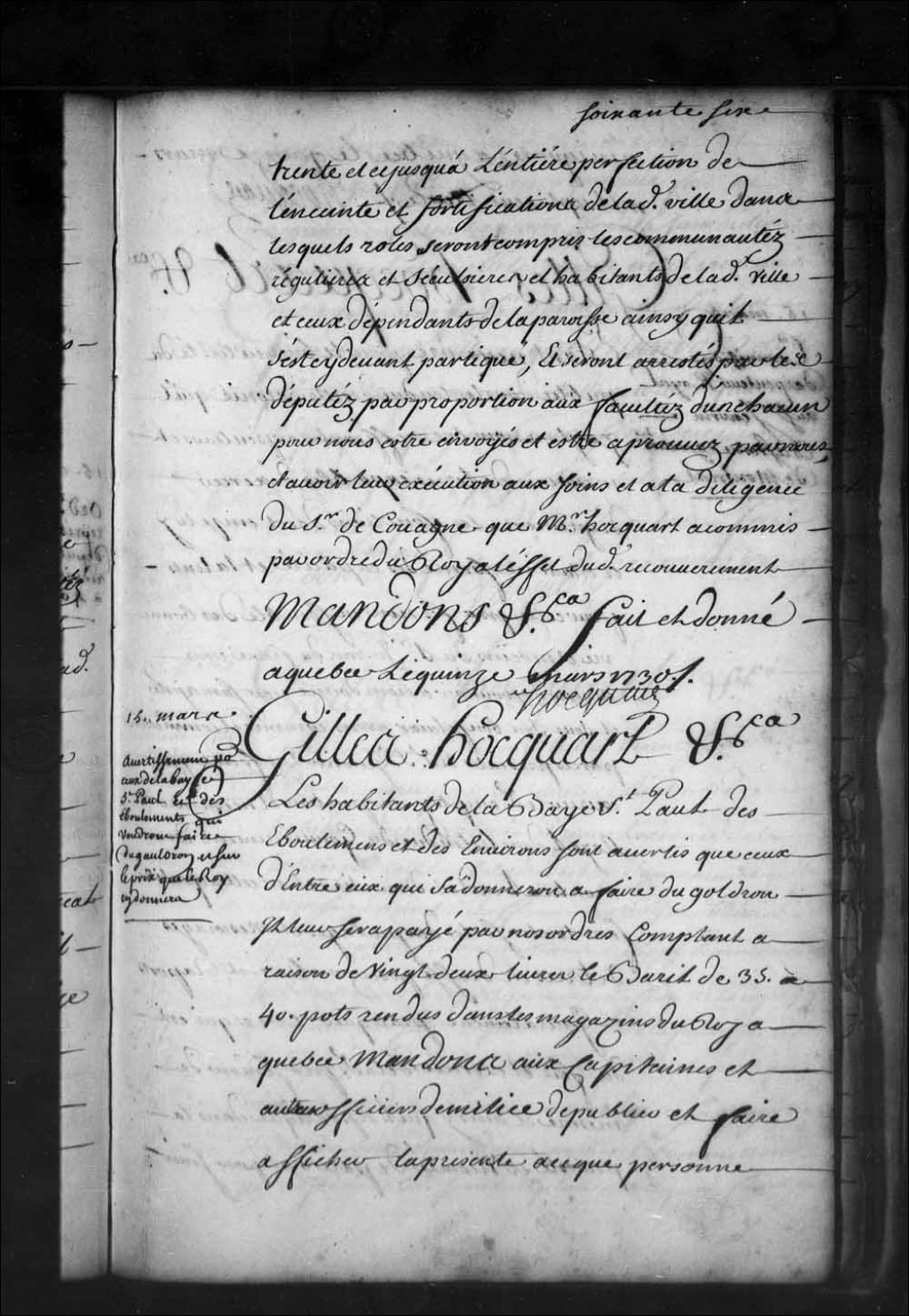 Ordonnance de Gilles Hocquart, faisant les fonctions d'intendant, qui fait savoir aux habitants de la Baie-Saint-Paul, des Éboulements et des environs que ceux d'entre eux qui se donneront à faire du goudron seront payés comptant à raison de vingt-deux livres le baril de 35 à 40 pots rendus dans les magasins du Roi à Québec, 16 mars 1730, Archives nationales à Québec, Fonds Intendants, (03Q,E1,S1,D17,P2079).