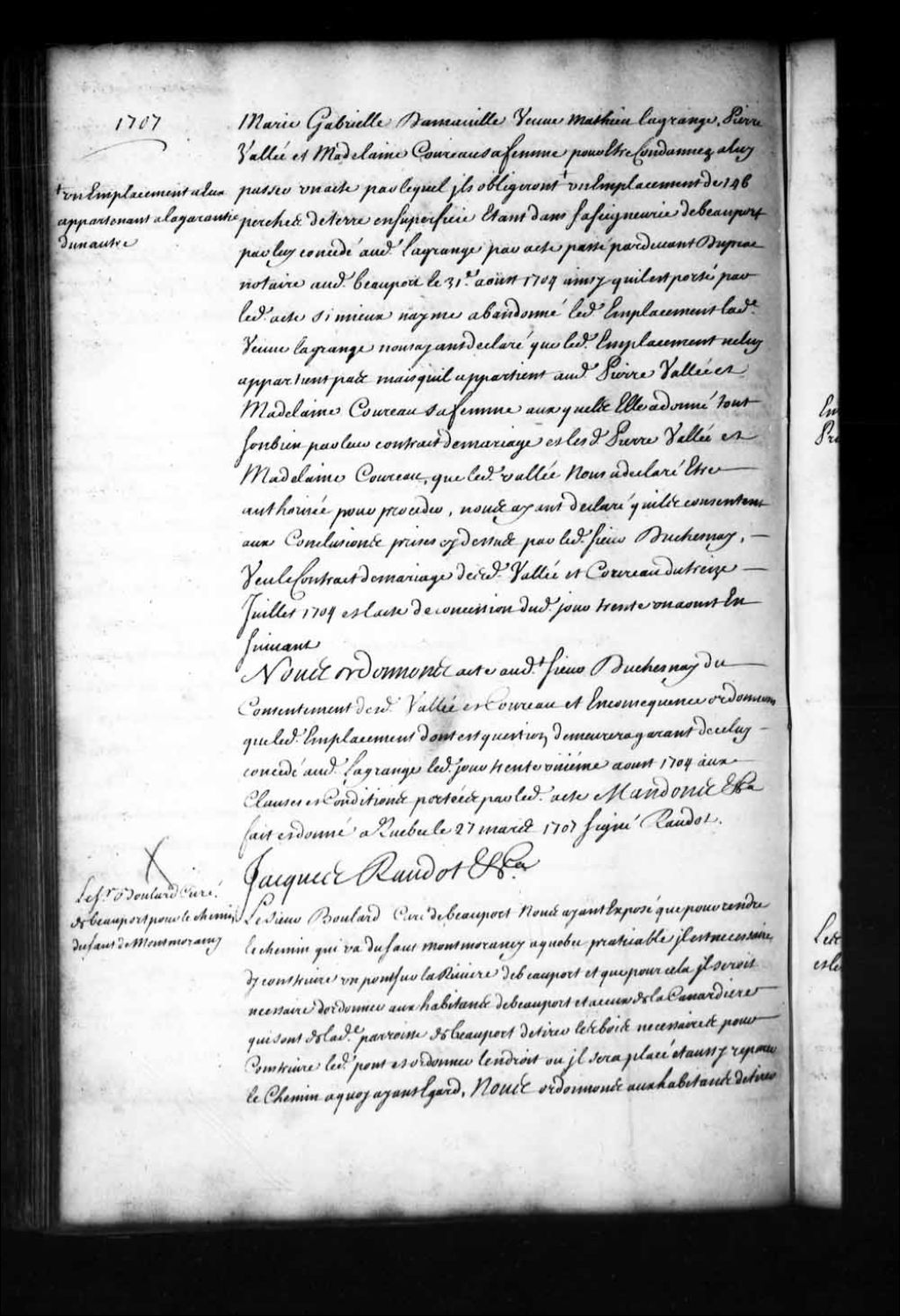 Ordonnance de l'intendant Jacques Raudot qui oblige les habitants de Beauport à tirer le bois nécessaire pour réparer le chemin qui va du saut Montmorency à Québec et pour construire un pont sur la rivière de Beauport, 29 mars 1707, Archives nationales à Québec, Fonds Intendants, (03Q,E1,S1,D1,P208).