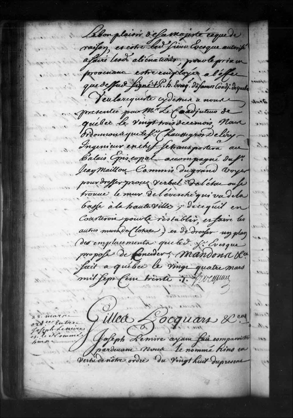 Ordonnance de Gilles Hocquart, faisant les fonctions d'intendant, qui commet le sieur Chaussegros de Léry, ingénieur en chef, pour se transporter au palais épiscopal de Québec, accompagné de Jean Maillou (Mailloux), commis du grand voyer, afin de dresser procès-verbal de l'état où se trouve le mur de l'évêché qui va de la basse à la Haute-Ville; de ce qu'il en couterait pour le rétablir et faire les autres murs de clôture, et de dresser un plan des emplacements que monseigneur Dosquet propose de concéder
