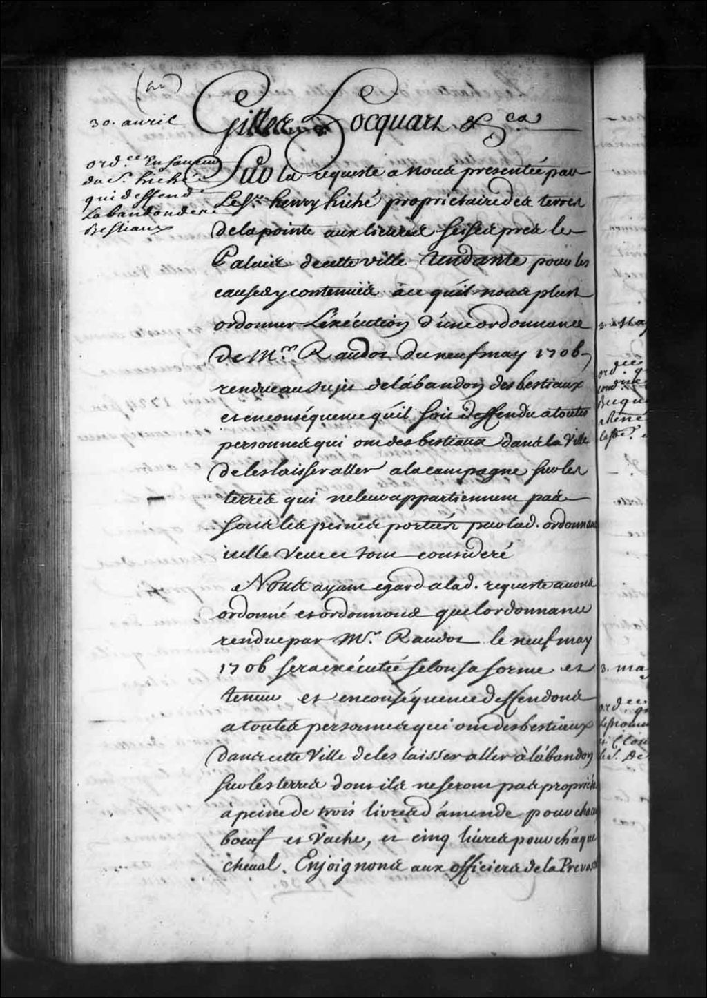 Ordonnance de Gilles Hocquart, faisant les fonctions d'intendant, qui réitère les défenses faites à toutes personnes qui ont des bestiaux dans la ville de Québec de les laisser aller à l'abandon sur les terres dont ils ne sont pas propriétaires à peine de trois livres d'amende pour chaque boeuf et vache et cinq livres pour chaque cheval, 30 avril 1730, Archives nationales à Québec, Fonds Intendants, (03Q,E1,S1,D17,P2105).