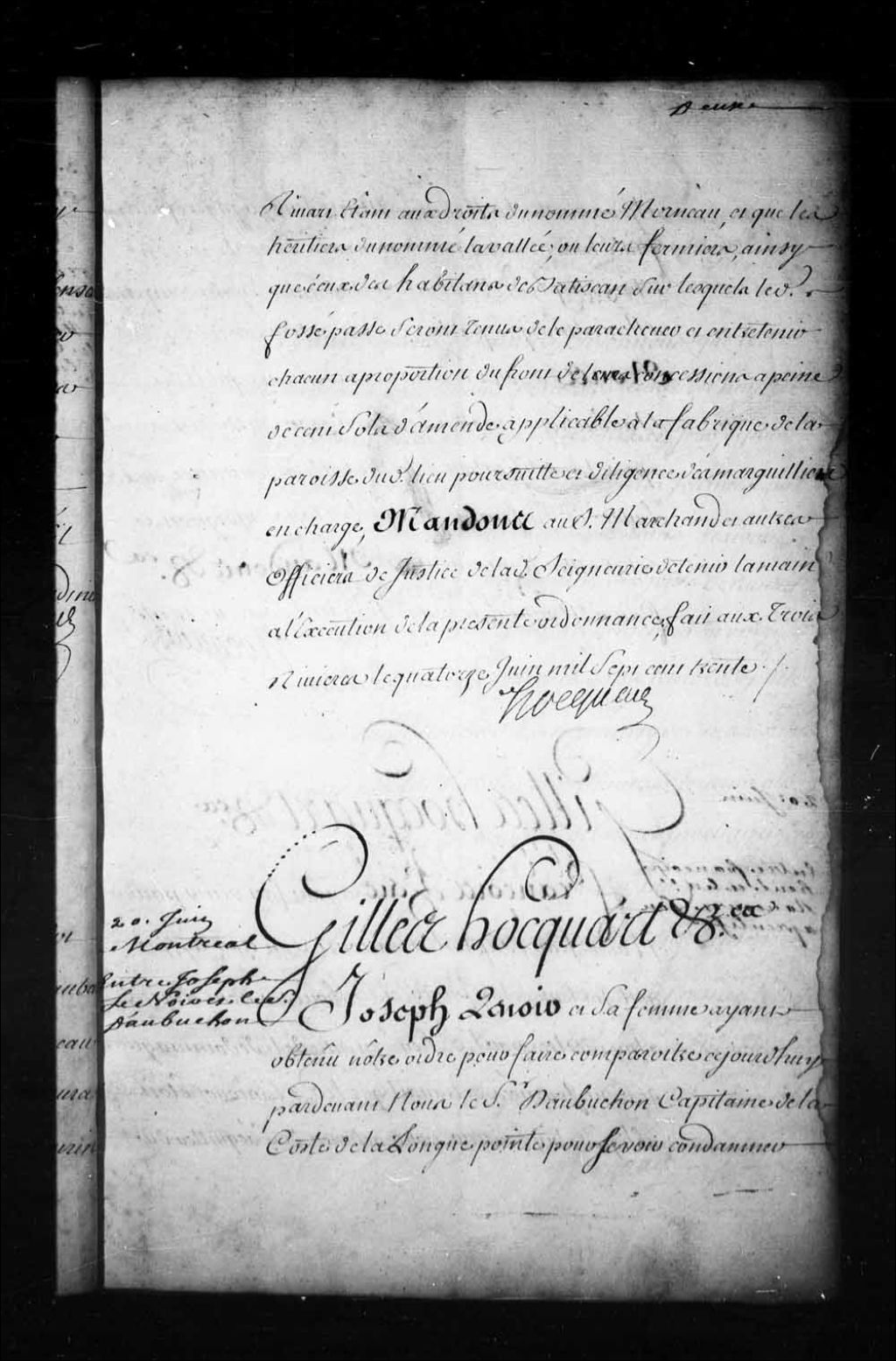 Ordonnance de Gilles Hocquart, faisant les fonctions d'intendant, qui condamne Joseph Aubuchon, capitaine de la côte de la Longue-Pointe, à remettre immédiatement à Joseph Lenoir la nommée Marie, son engagée, qui a quitté sa maison par mauvais conseils pour se retirer chez le sieur Aubuchon, 20 juin 1730, Archives nationales à Québec, Fonds Intendants, (03Q,E1,S1,D18,P2141).